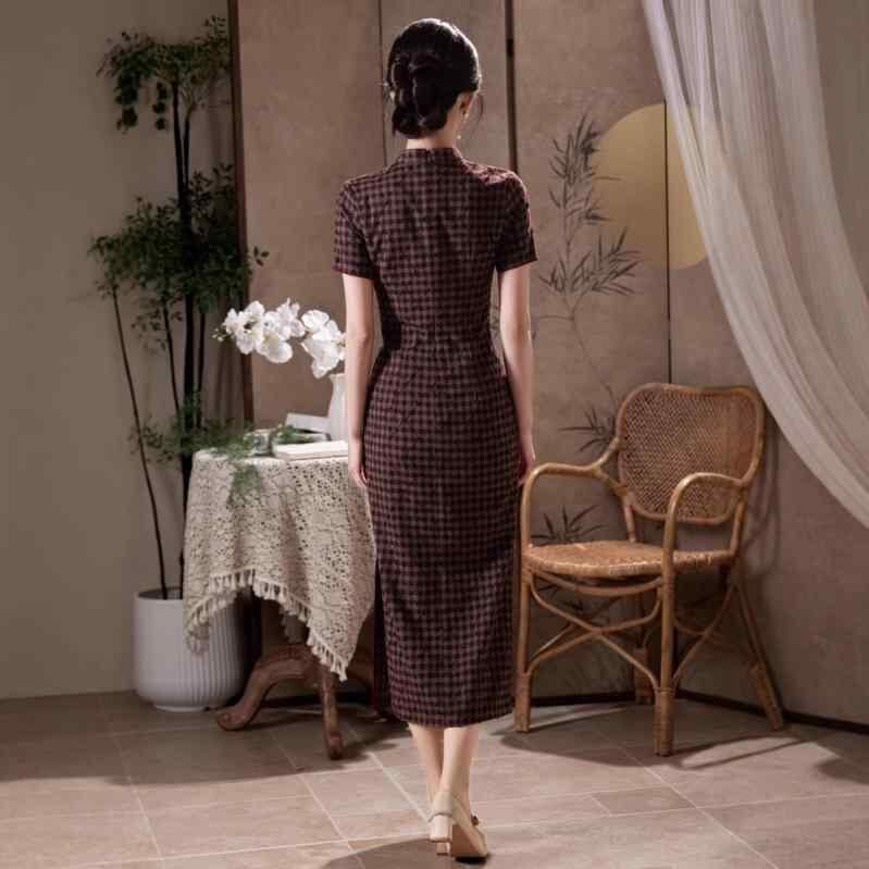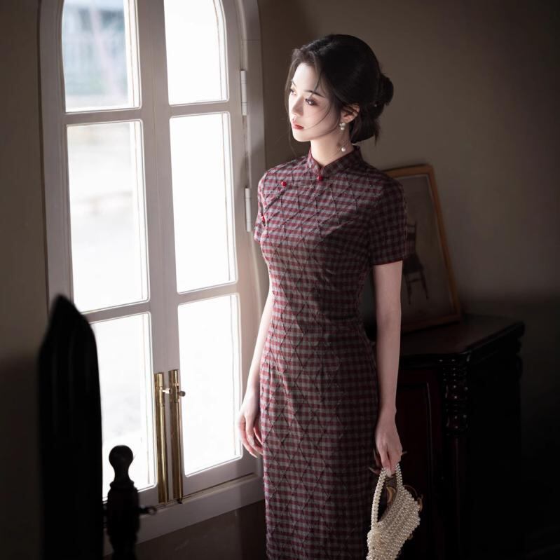 ワンピース レディース レトロ 新中国風 改良 チェック柄 チャイナドレス 半袖 体型カバー ロング丈 スタンドカラー 斜め襟 ジャカード織 ポリエステル 伸縮性 フェミニン 普段使い レトロレッド 春夏