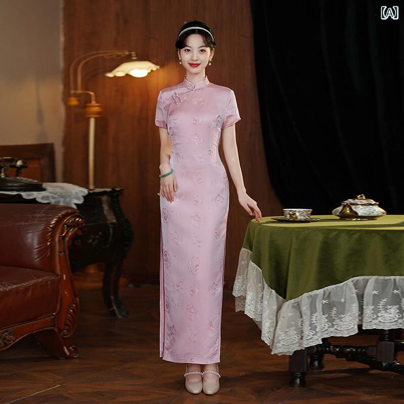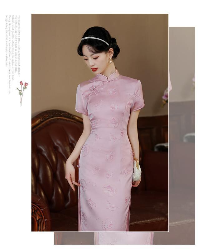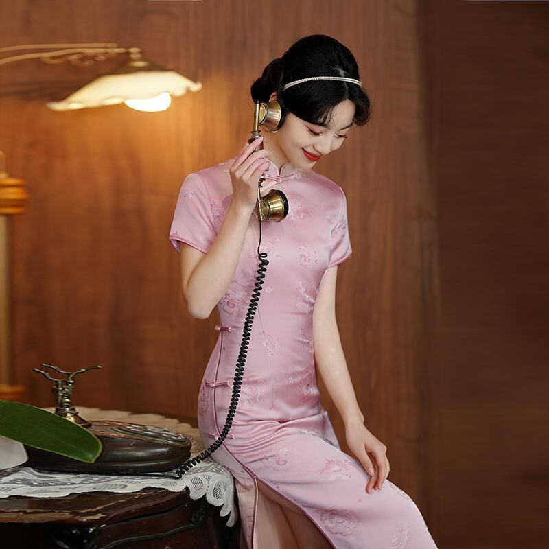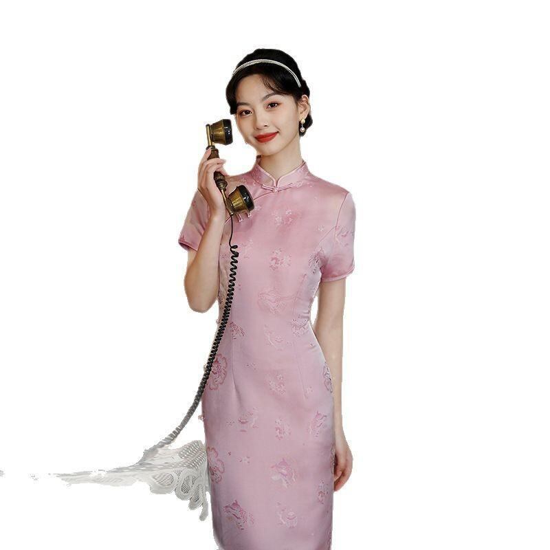 チャイナドレス レディース ミドル丈 ピーチピンク 改良 モダン 若々しい 高級感 スタンドカラー 斜め襟 3分袖 ラインストーン ポリエステル 婚約 披露宴 春夏