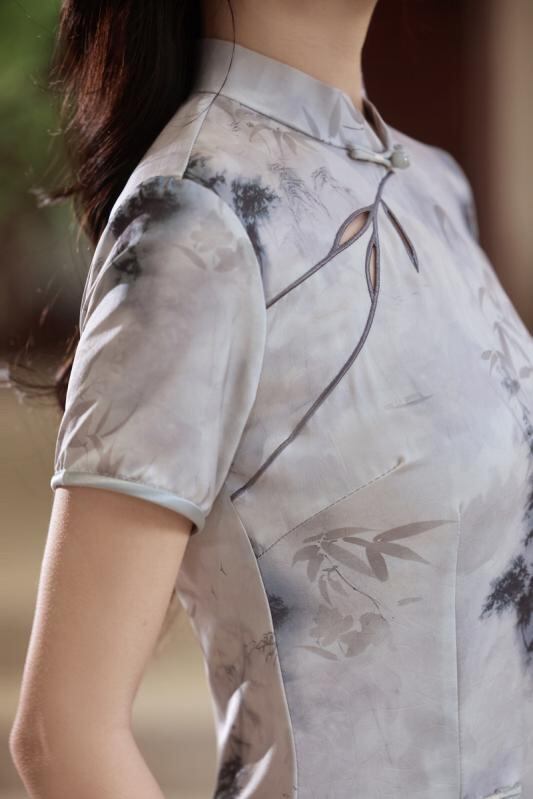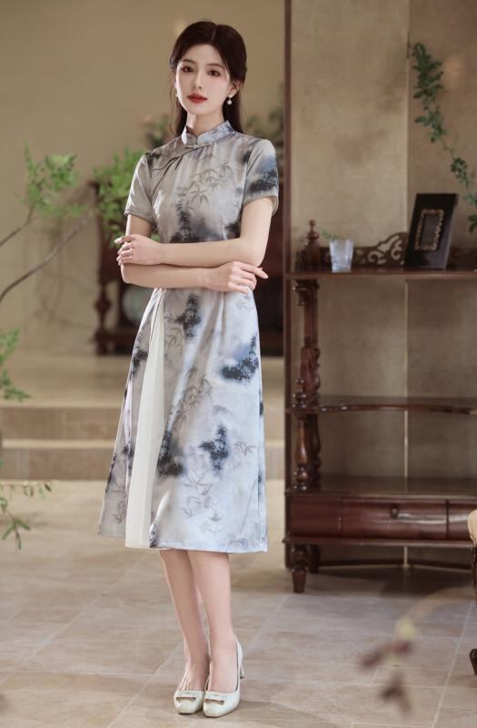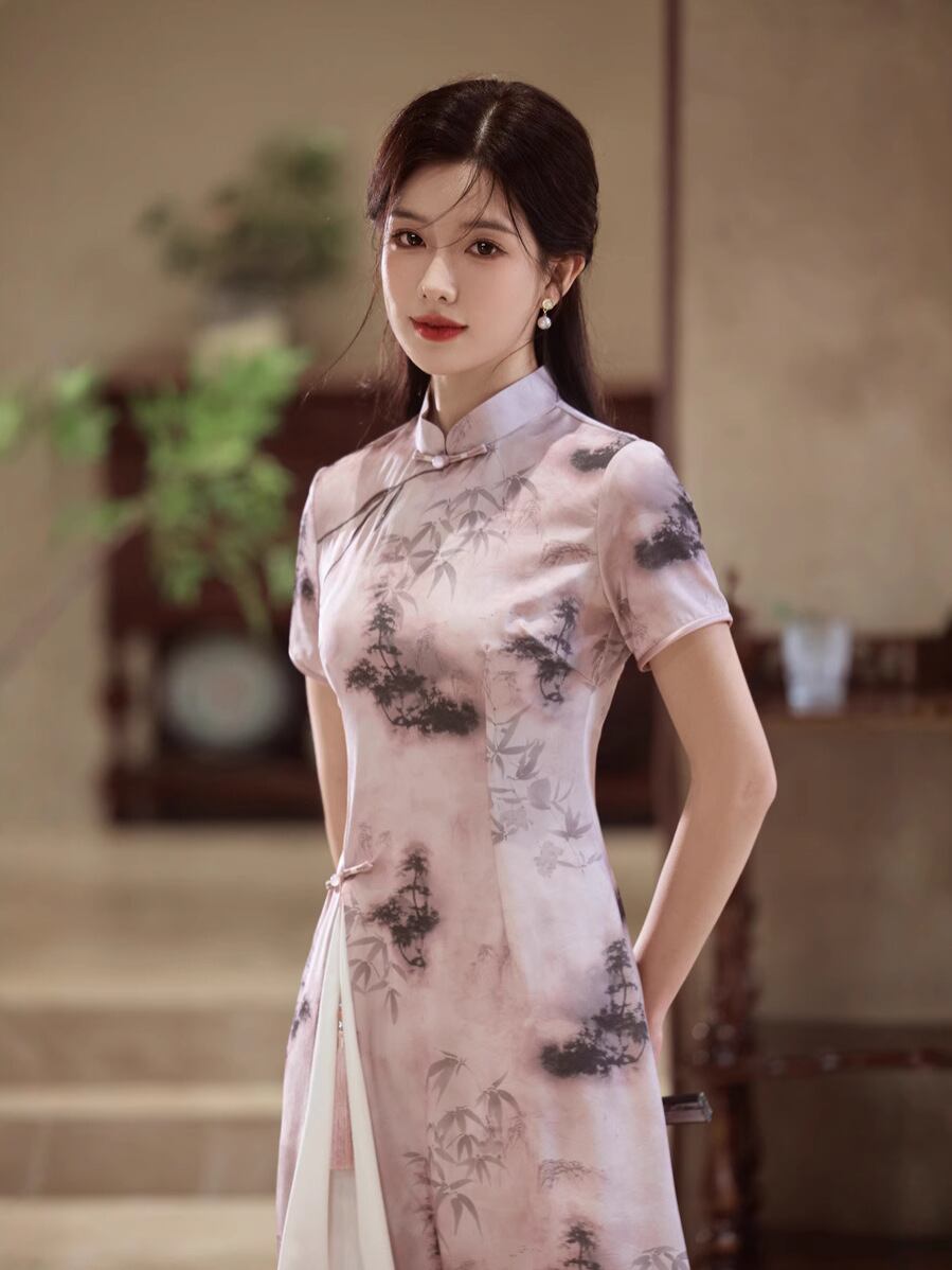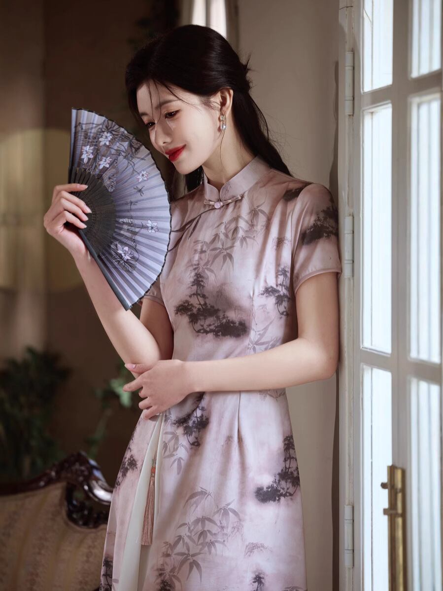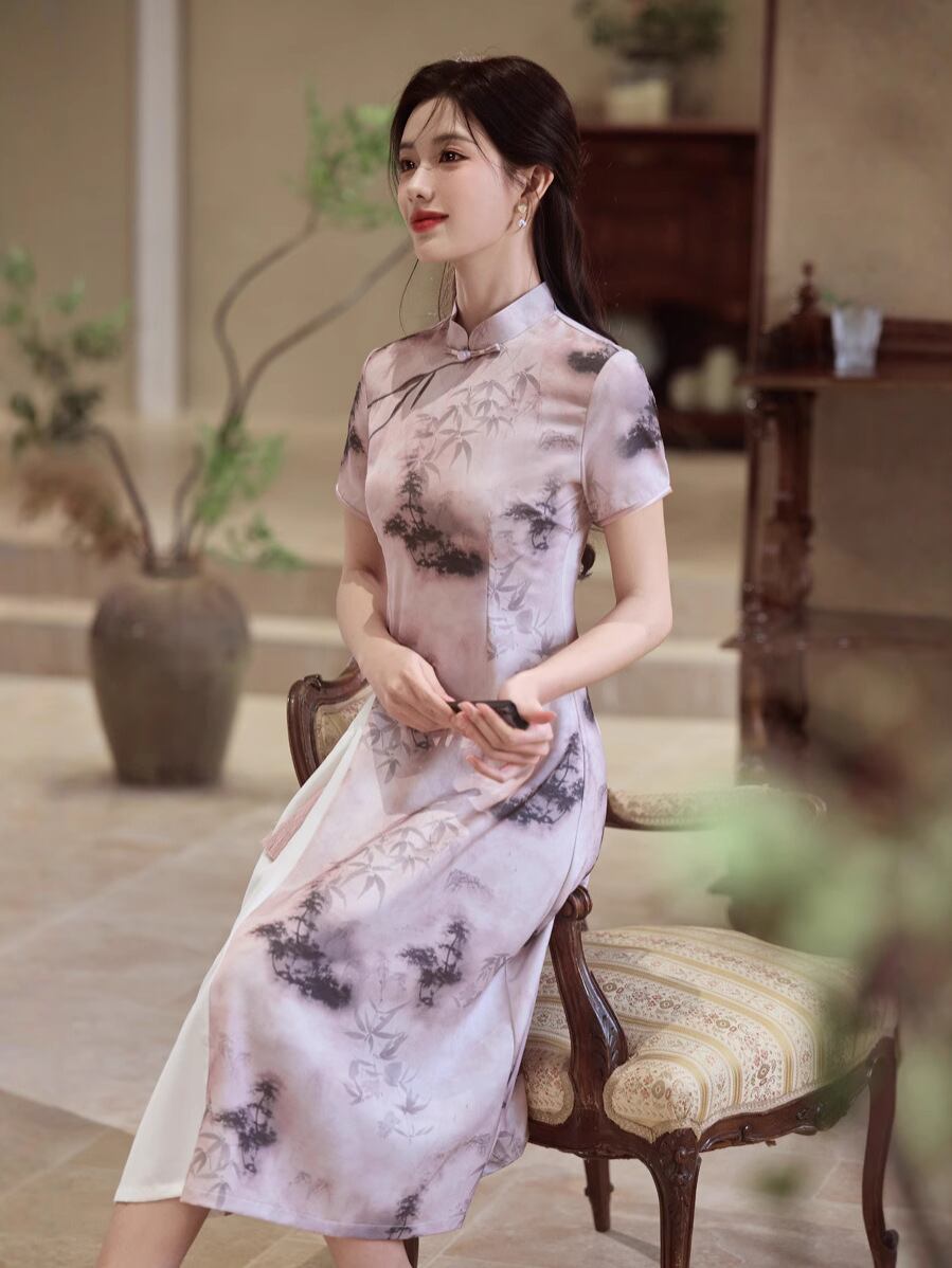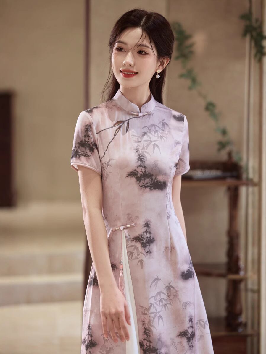 チャイナドレス レディース 新チャイナスタイル 水墨画 スタイルアップ 細見え ポリエステル サテン生地 伸縮性 スタンドカラー 3分袖 レトロ クラシック ワンピース 茶服 春夏 ピンク グレー 普段使い