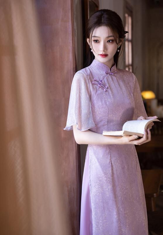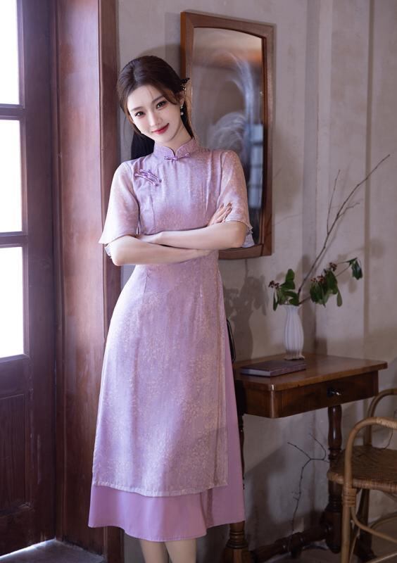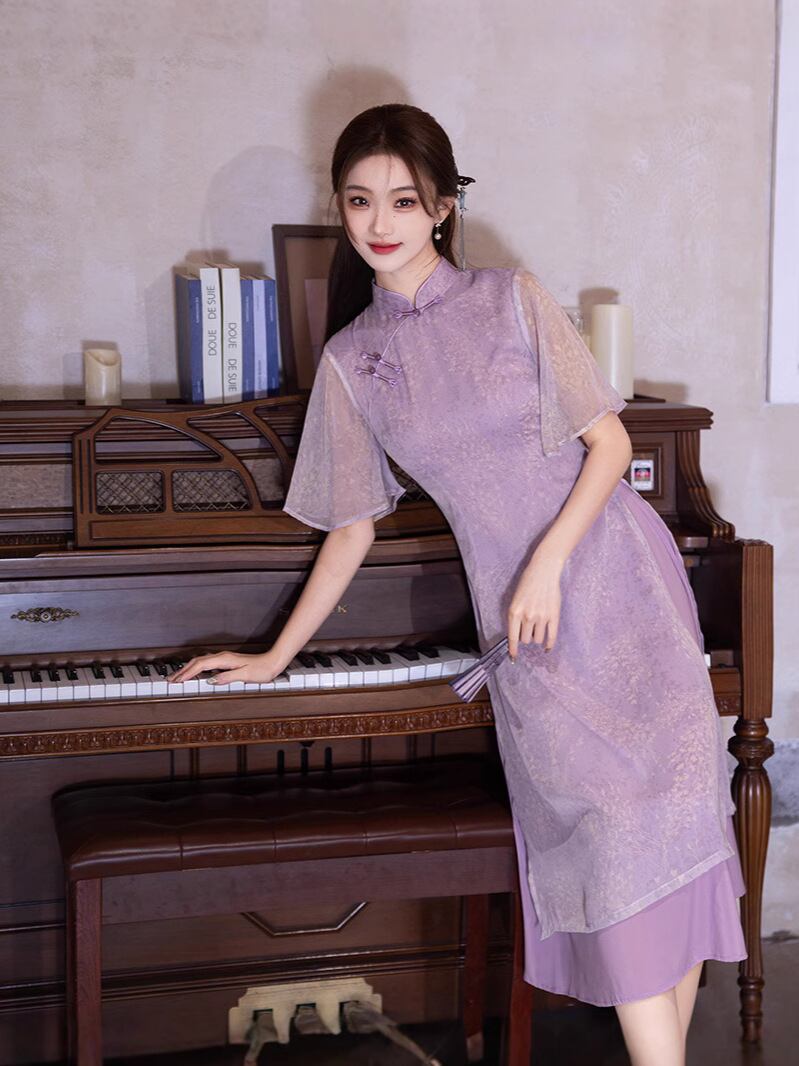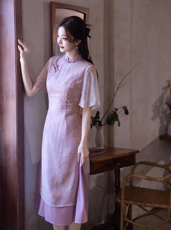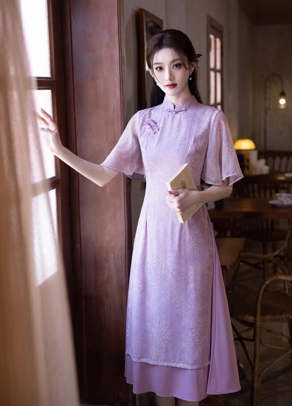 チャイナドレス レディース 紫色 ドルマンスリーブ 七分袖 ロング丈 マキシ丈 スタンドカラー 斜め襟 シルククレープ ストレッチ エレガント 上品 レトロ 改良 普段使い お出かけ 春夏