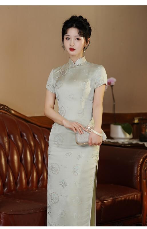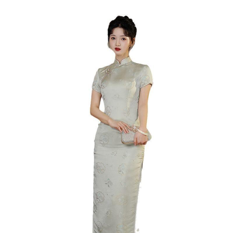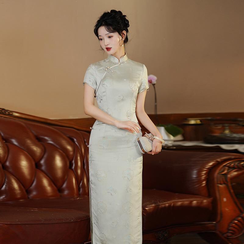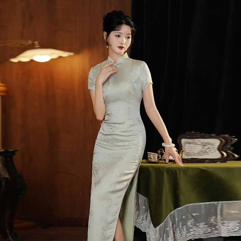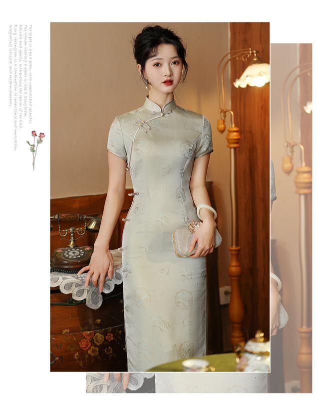 チャイナドレス レディース 春夏 再生繊維 ポリエステル エレガント レトロ 新中華風 スリム ロング丈 ワンピース スタンドカラー 3分袖 ジャガード織り 上品 通勤 オフィス グレーブルー