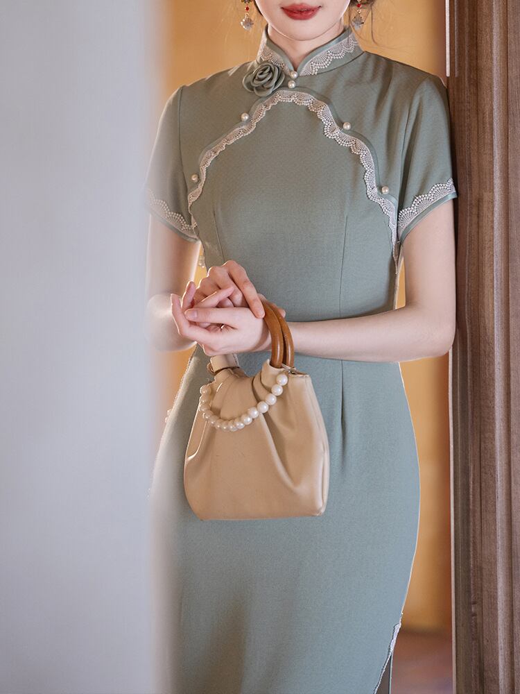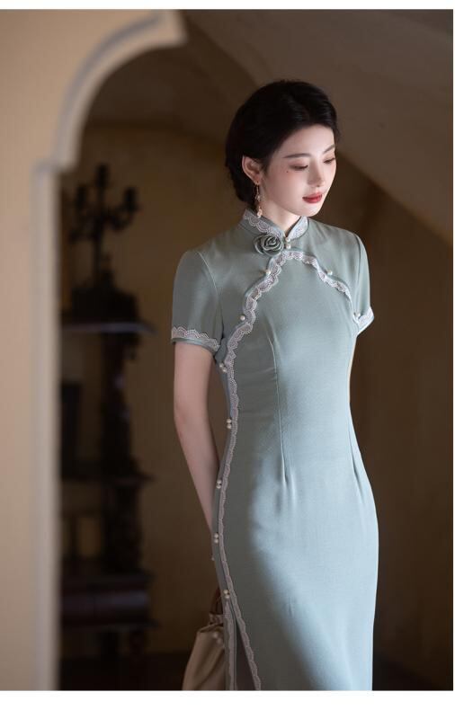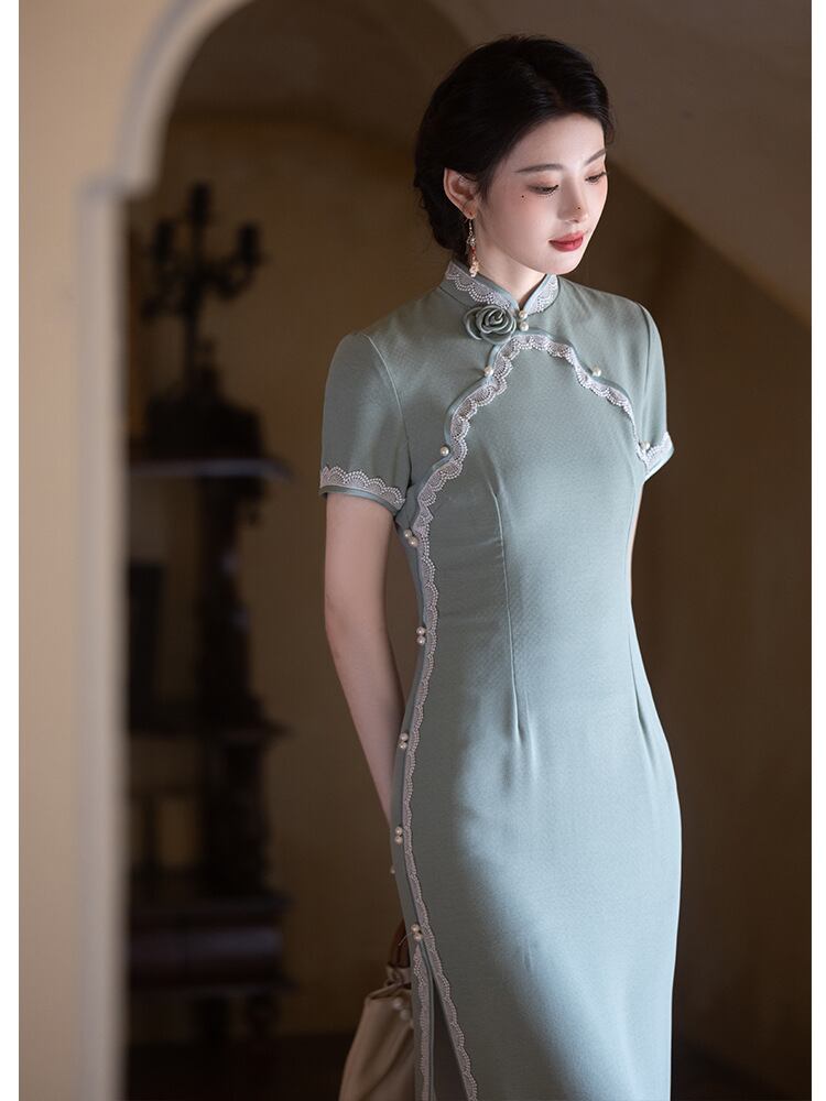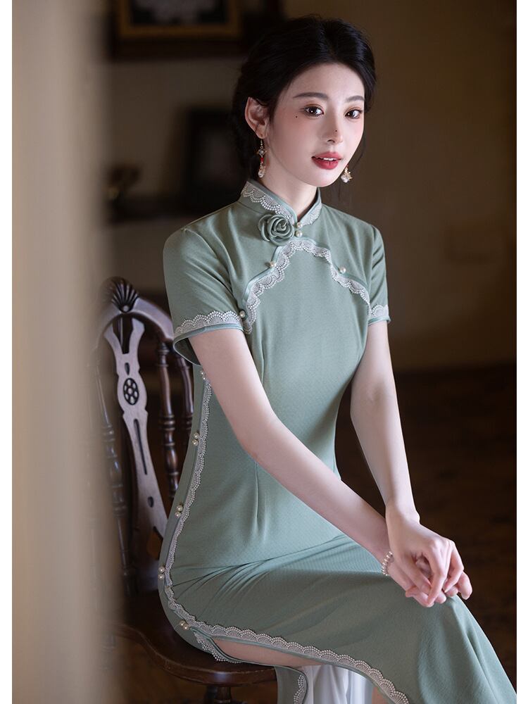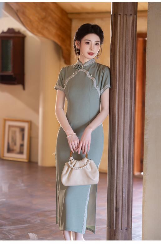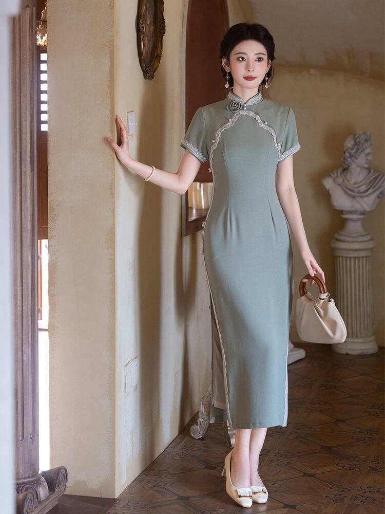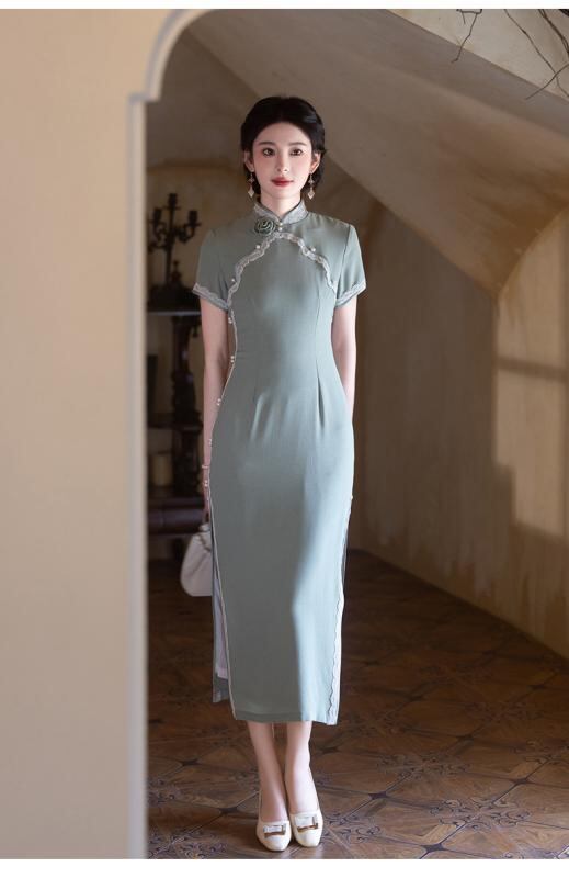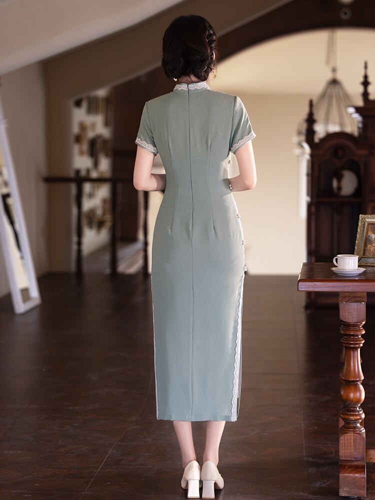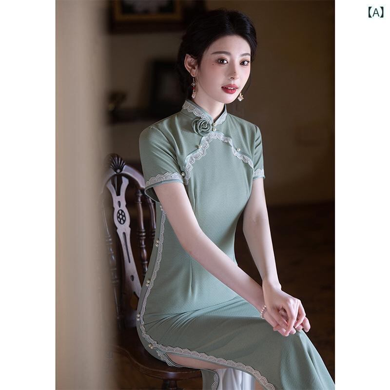 チャイナドレス レディース 新中華風 改良 山茶グリーン ロング丈 半袖 スタンドカラー 斜め襟 スリット 普段使い デイリーユース 低身長 小柄 プチサイズ エレガント ワンピース 春夏 再生繊維