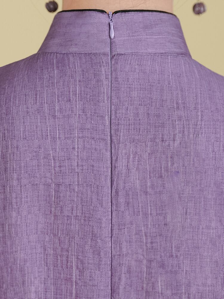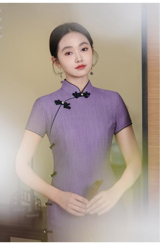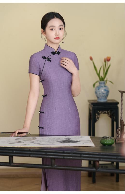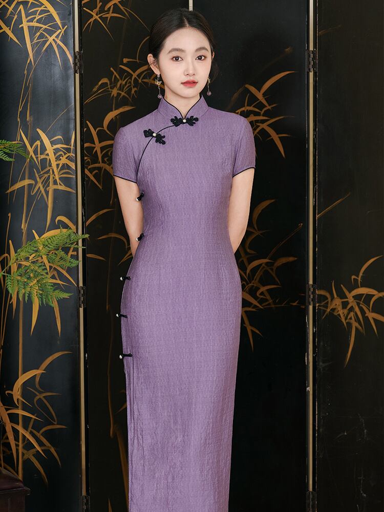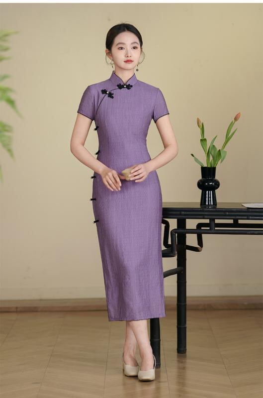 ワンピース レディース チャイナドレス 小柄向け 改良デザイン レトロ 上品 エレガント 高級感 レーヨン スタンドカラー 五分袖 ロング スリット 普段使い 中国風 パープル 紫 春夏