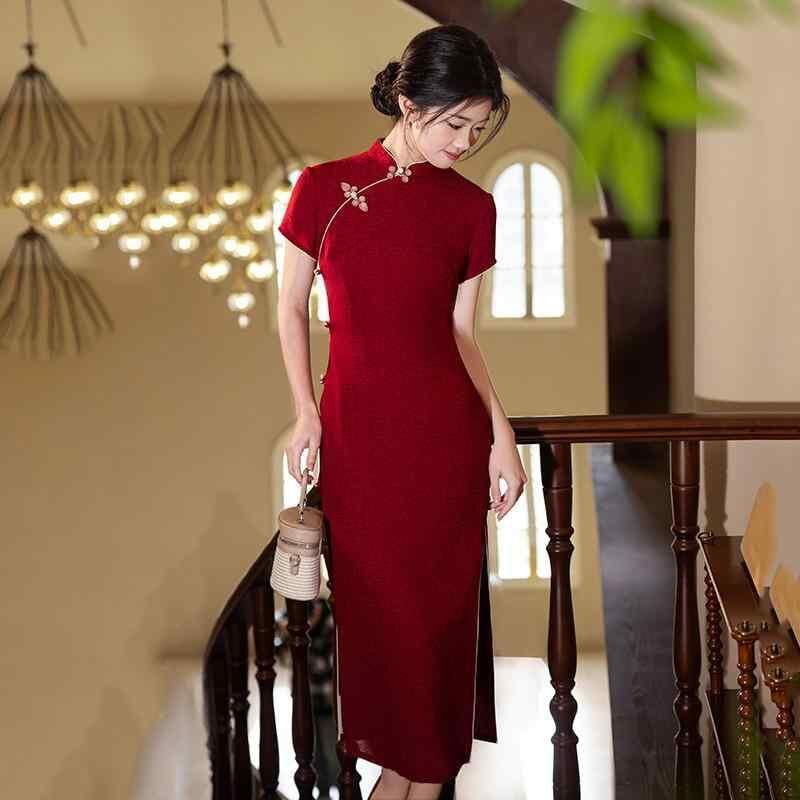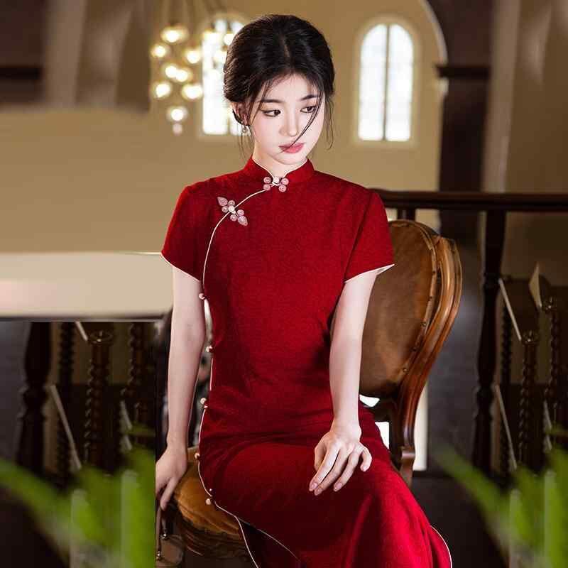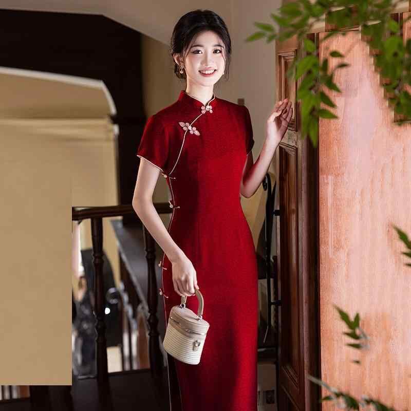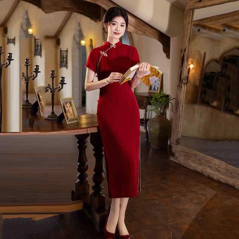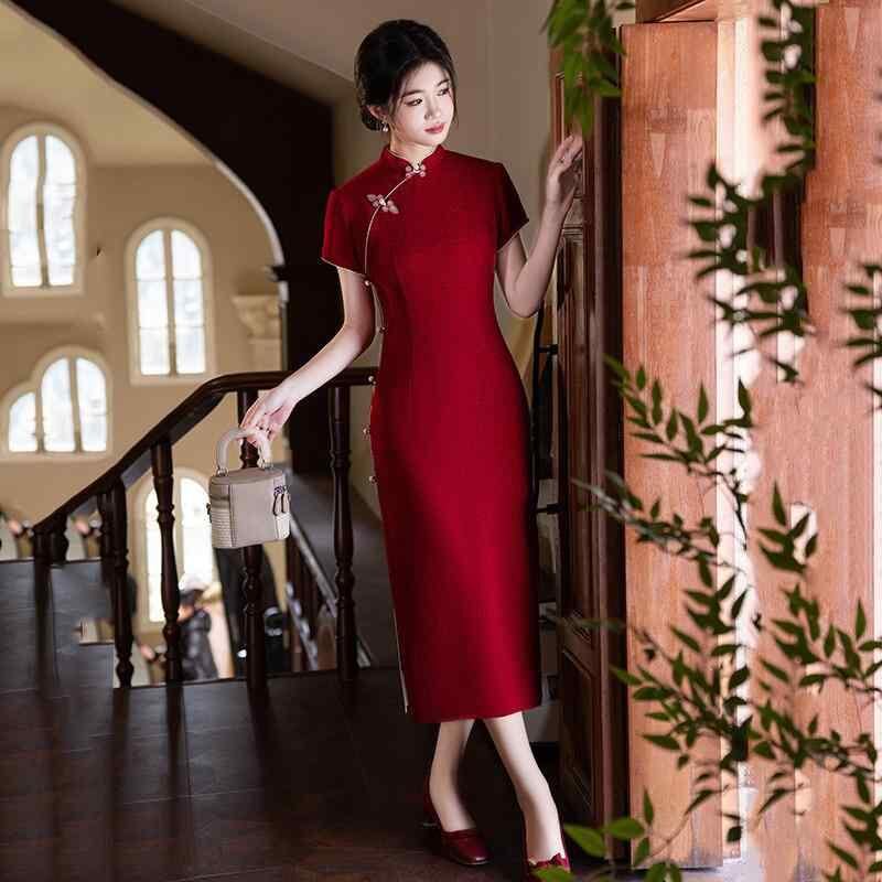 チャイナドレス レディース 女性用 結婚式 二次会 披露宴 花嫁 スタイルアップ ロング丈 レトロモダン 中華風 スタンドカラー 3分袖 スリット入り レッド 赤色 春夏