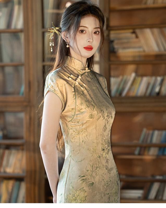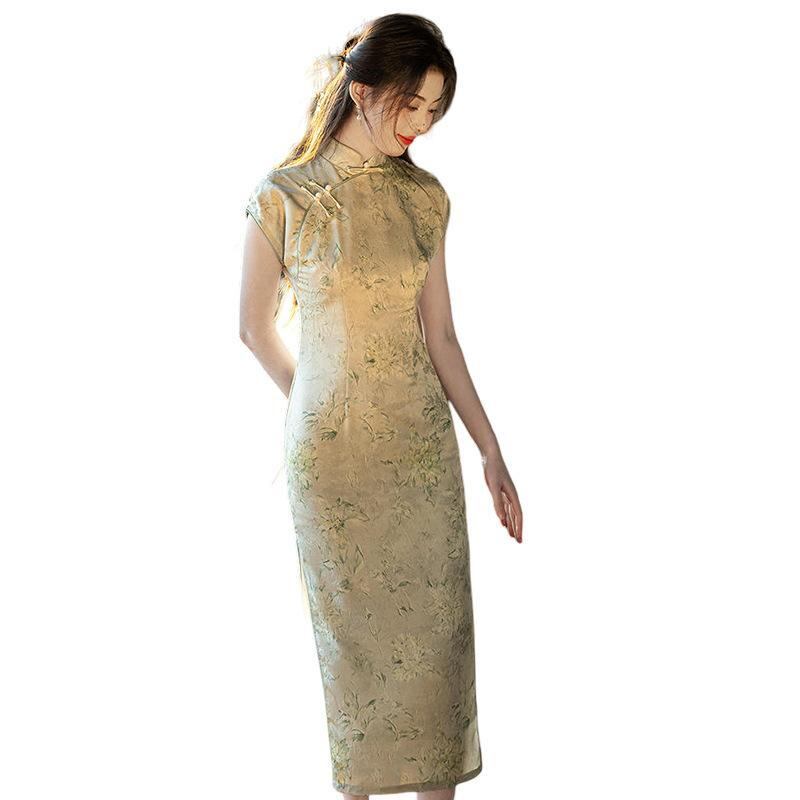 チャイナドレス レディース 緑 モダンチャイニーズ 改良デザイン 上品 エレガント ロング丈 スタンドカラー 斜め襟 3分袖 サイドスリット ポリエステル 春夏 ワンピース 通勤 フォーマル