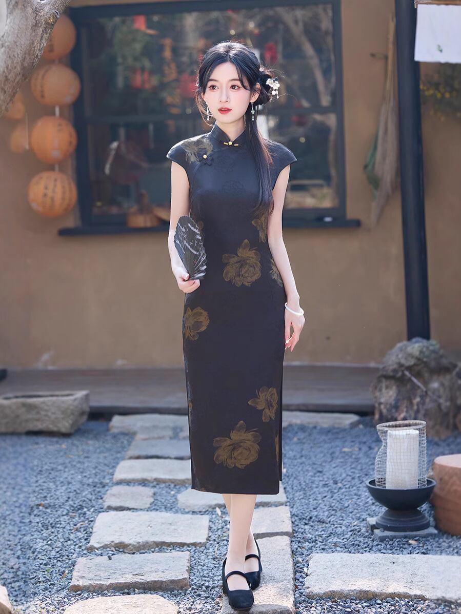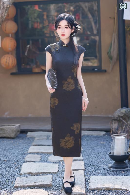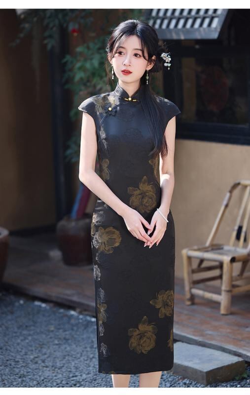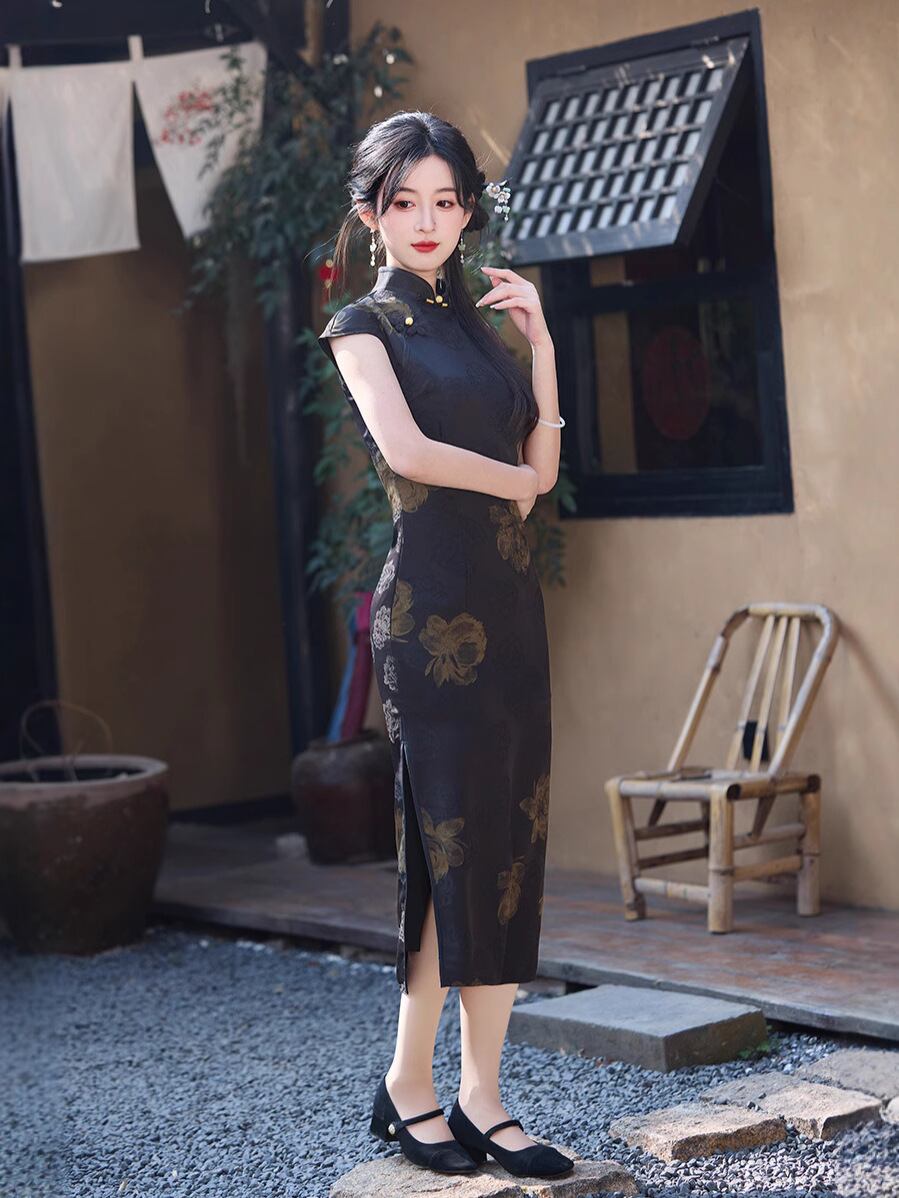 チャイナドレス ノースリーブ スタイリッシュ レディース ブラック 夏 サマー ネオチャイニーズ モダン 若見え 上品 エレガント ジャカード織り レトロ 大正ロマン風 高級感