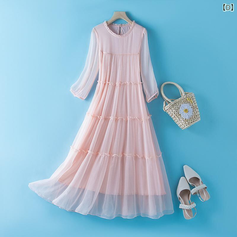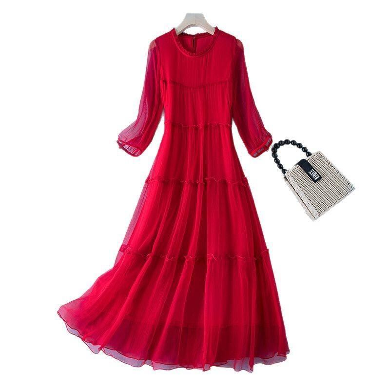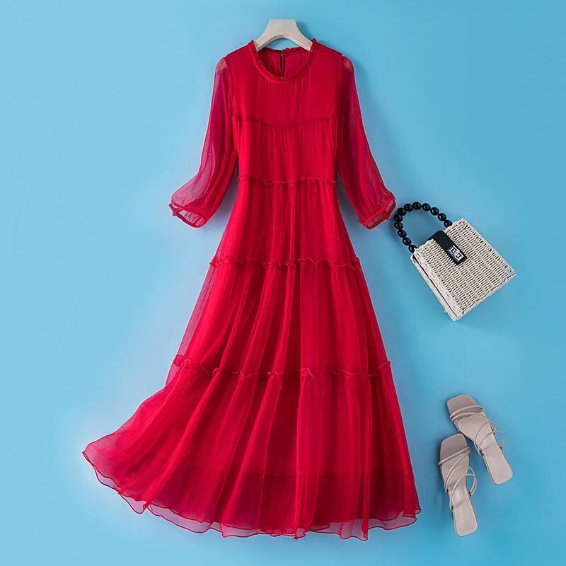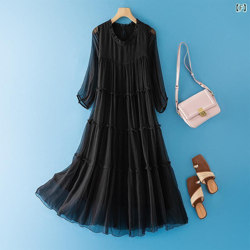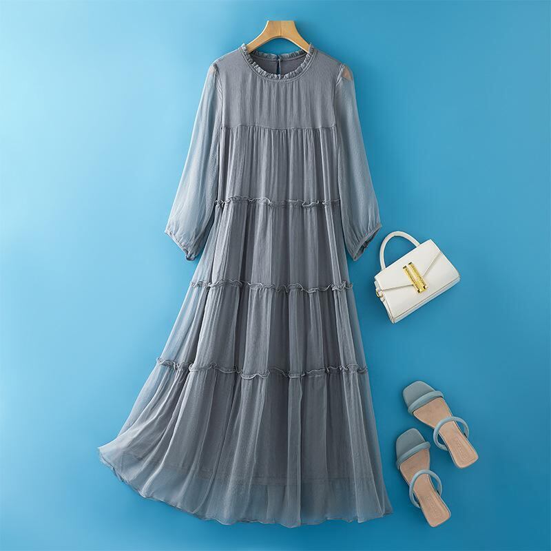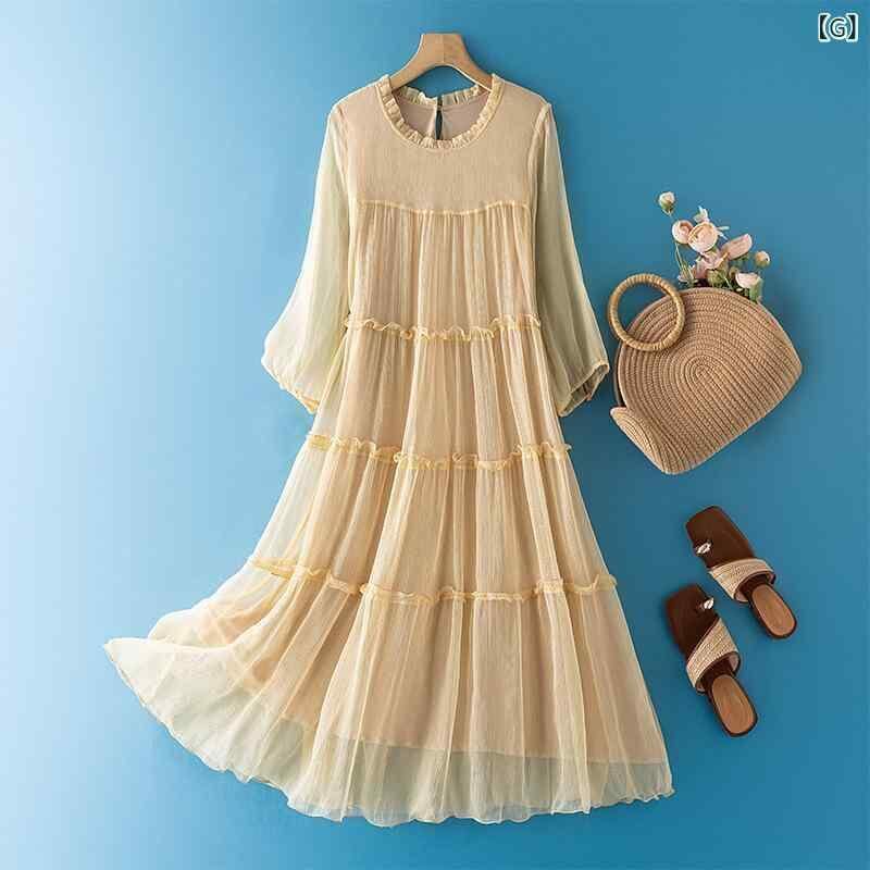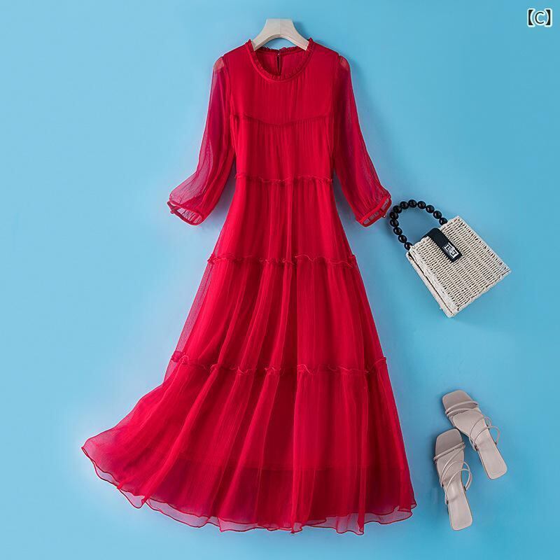 ワンピース レディース シルク 絹 韓国風 エレガント ビーチ リゾート 体型カバー 細見え リラックスフィット 五分袖 ラウンドネック ミディ丈 フレア フリル 無地 春夏