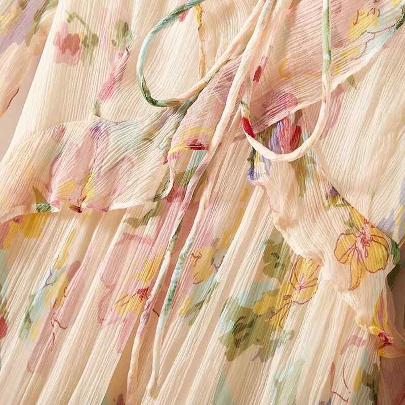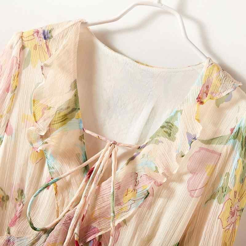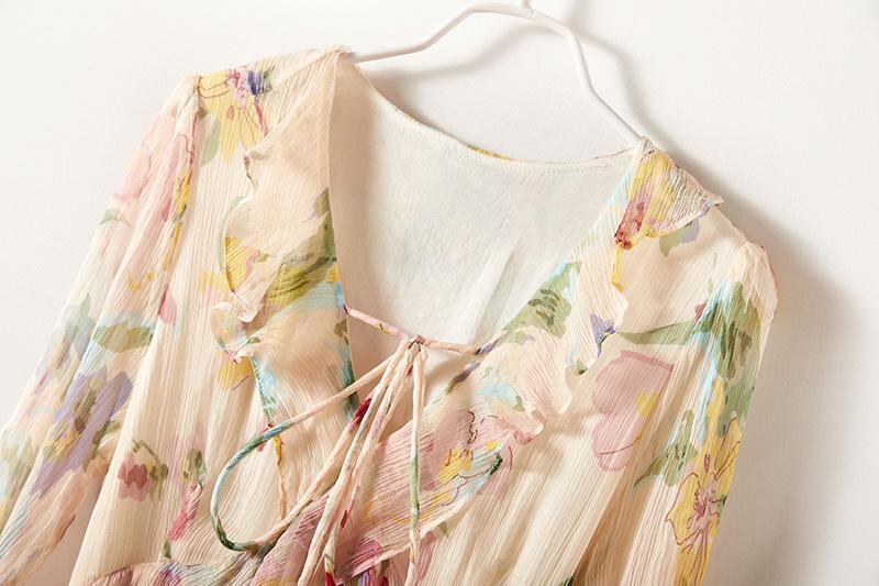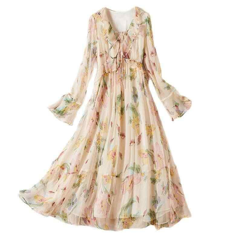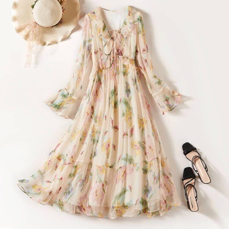 ワンピース レディース シルク 絹 花柄 プリント 長袖 Vネック ベルスリーブ ロング丈 マキシ丈 エレガント 上品 きれいめ リゾート オフィス 通勤 春夏
