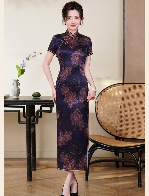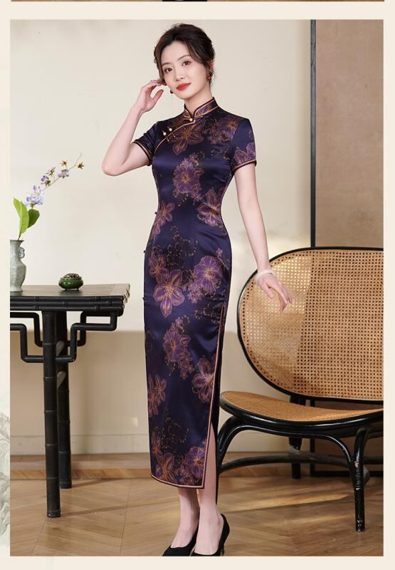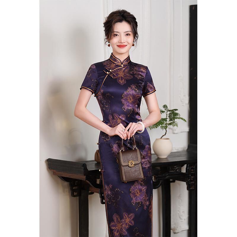 チャイナドレス レディース 桑蚕シルク ロング丈 改良デザイン レトロモダン 春夏 スタンドカラー 斜め襟 三分袖 ハイサイドスリット 伸縮性 デジタルプリント