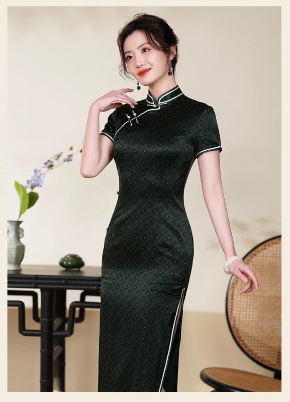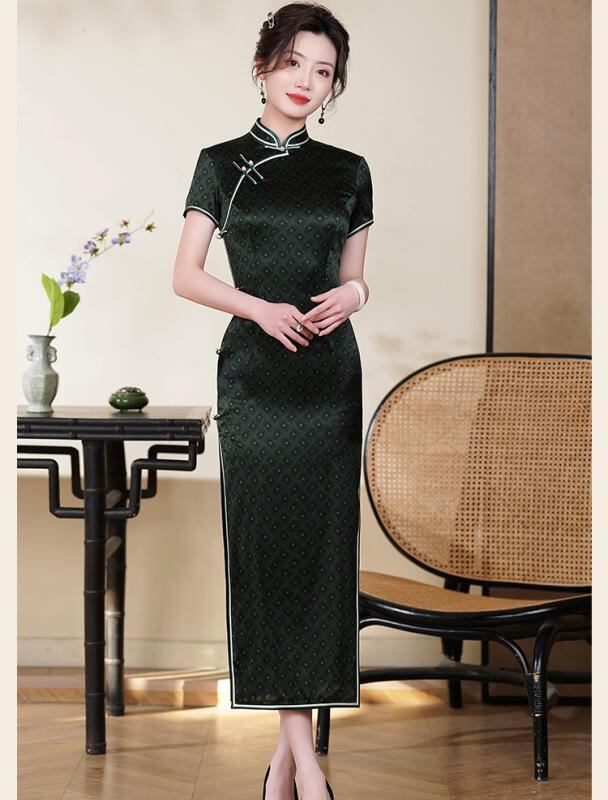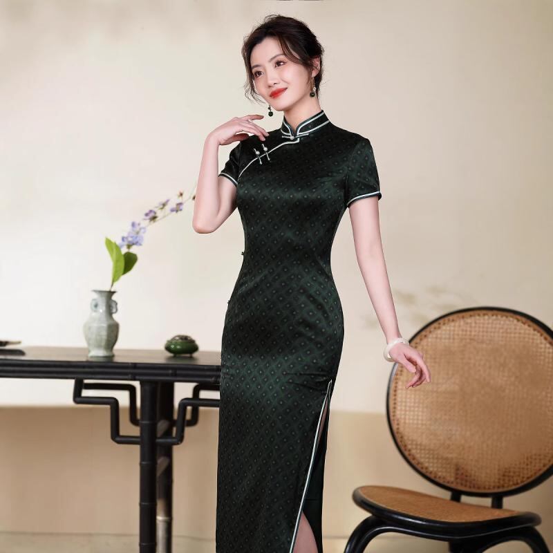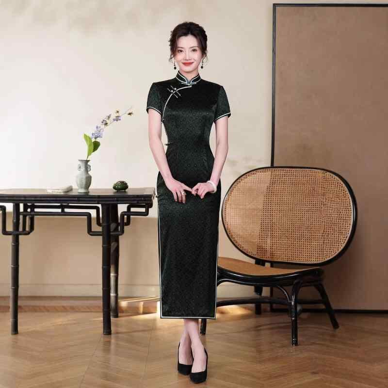 チャイナドレス レディース ワンピース ロング丈 改良 スタンドカラー 斜め襟 三分袖 ハイ スリット レトロ 中国風 エレガント 上品 高級桑蚕シルク 春夏