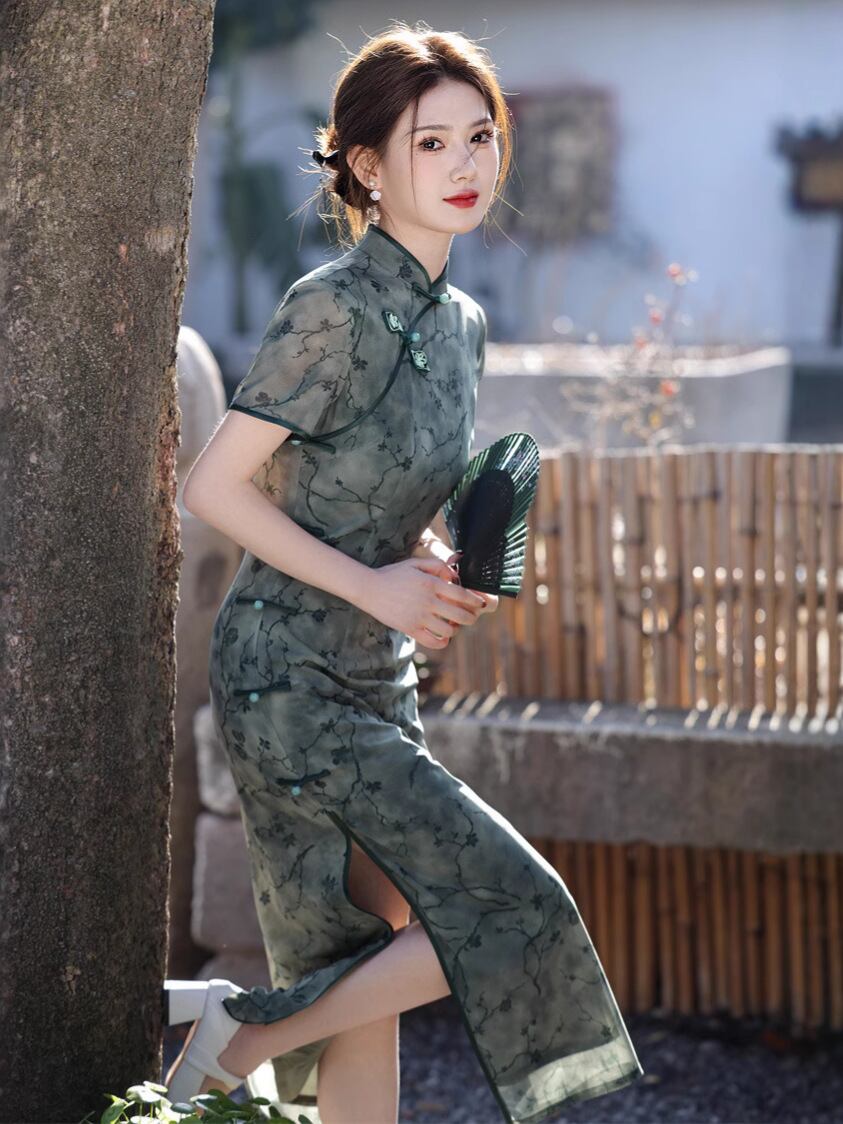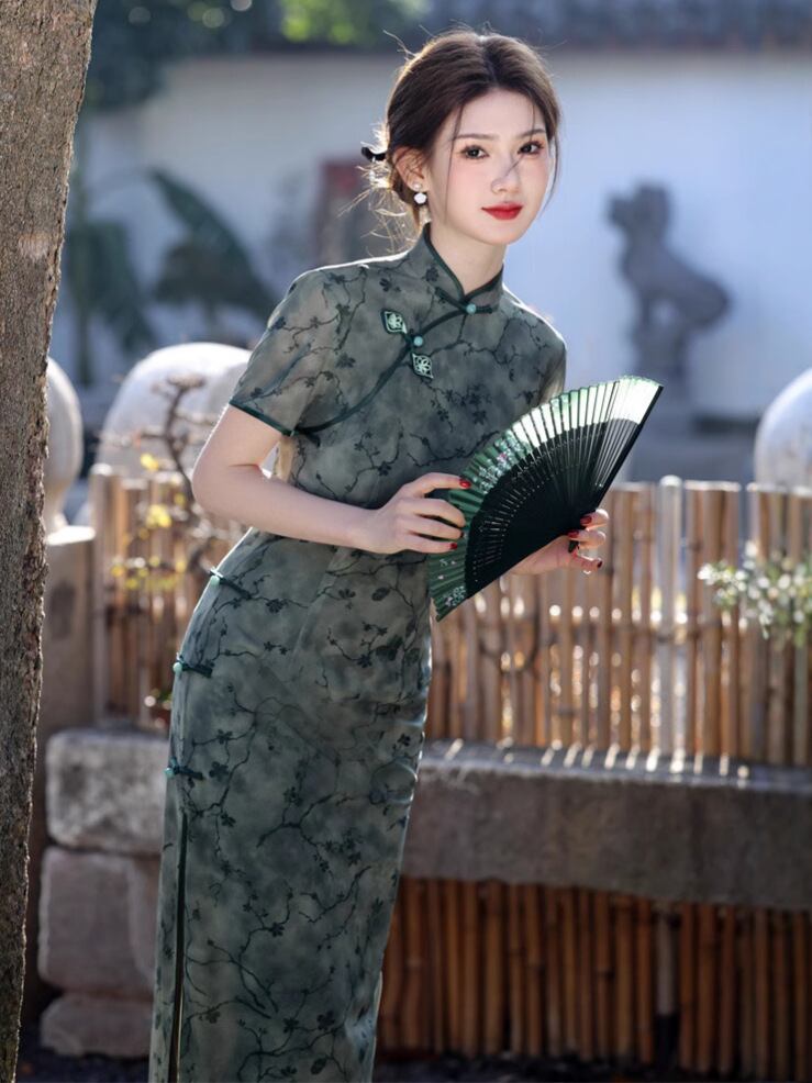 チャイナドレス レディース ワンピース 中国風 春夏中華風 エレガント 淑女風 グリーン メッシュ ロング丈 サイド八つボタン 風