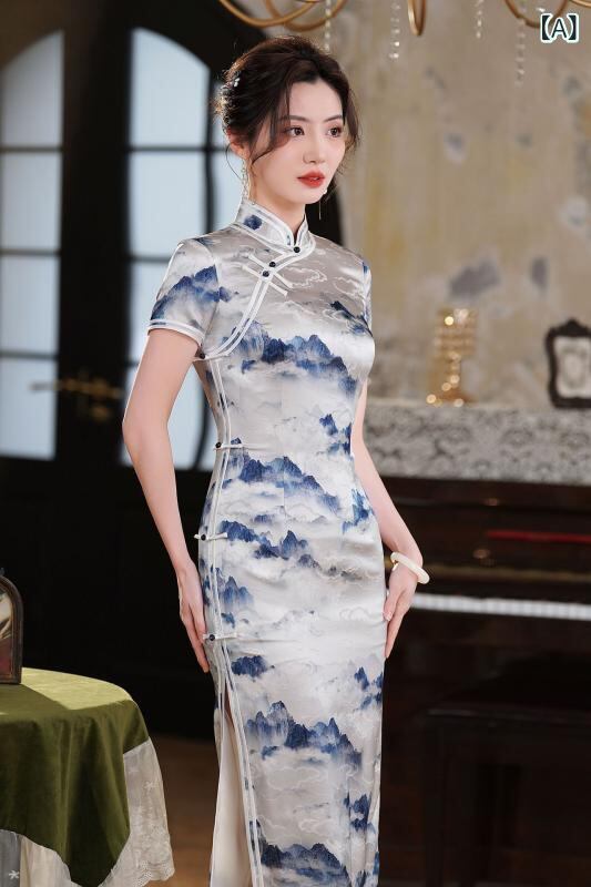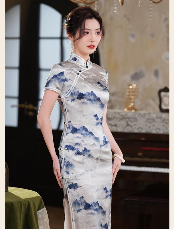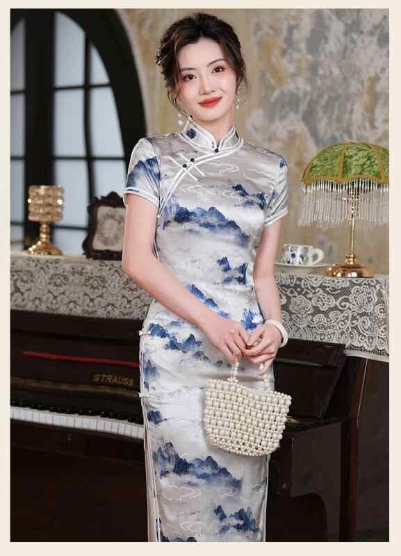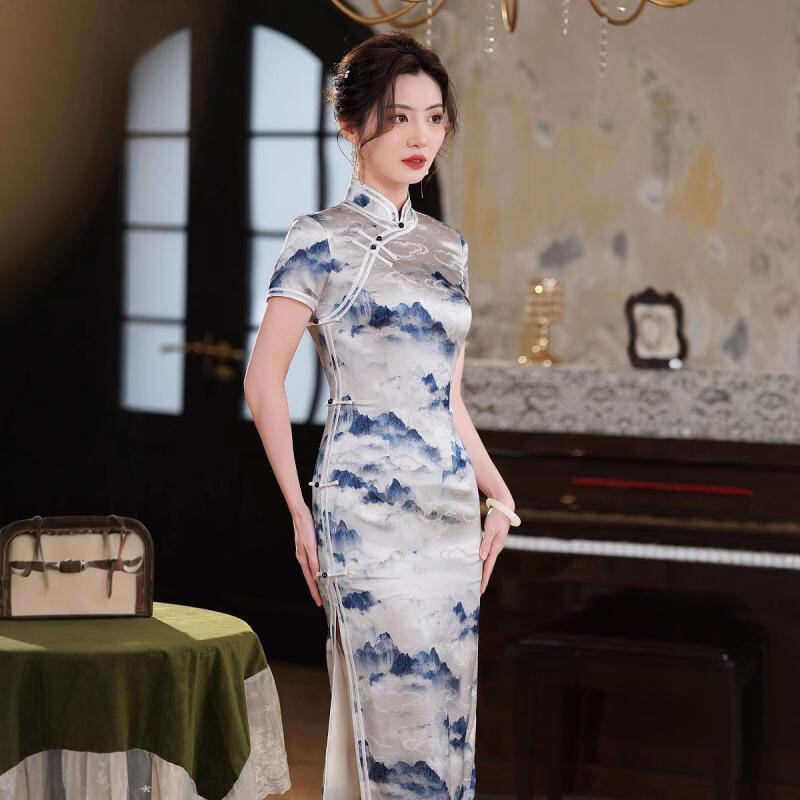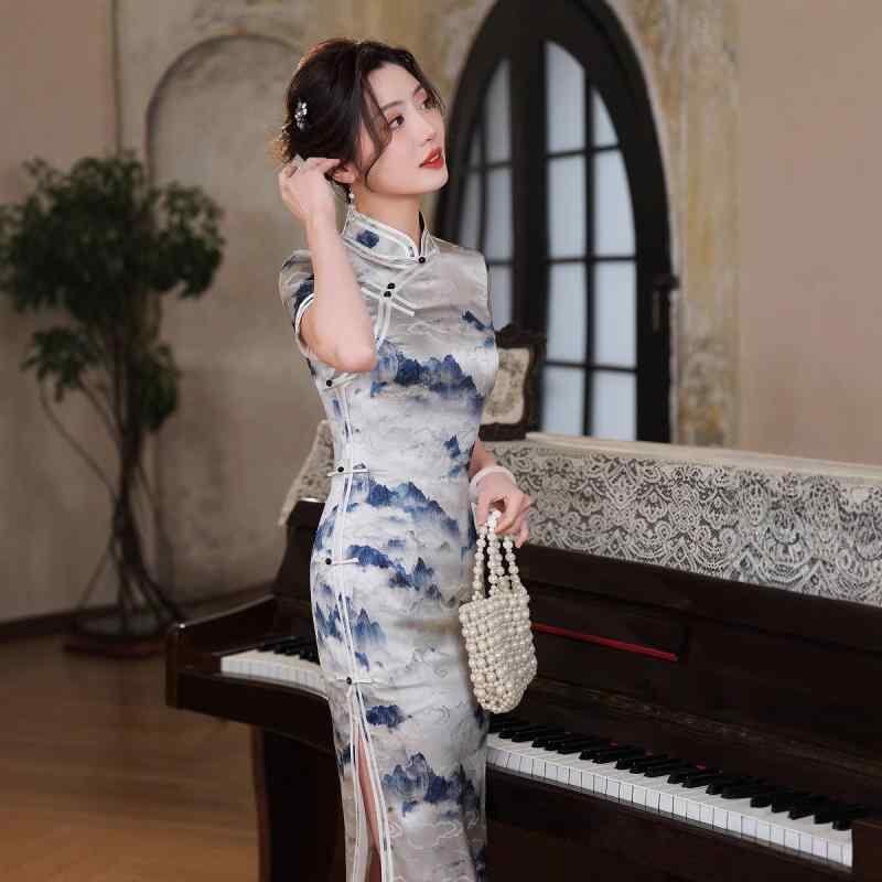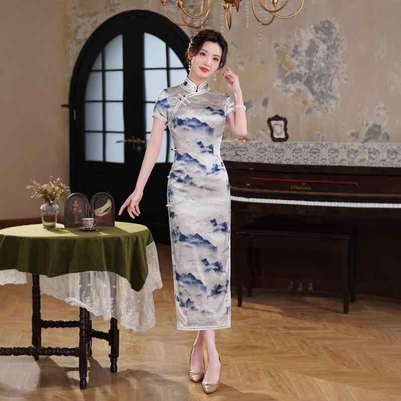 ワンピース レディース シルク チャイナドレス ロング丈 改良 レトロ 中国風 スタンドカラー 斜め襟 七分袖 スリット入り 伸縮性 春夏