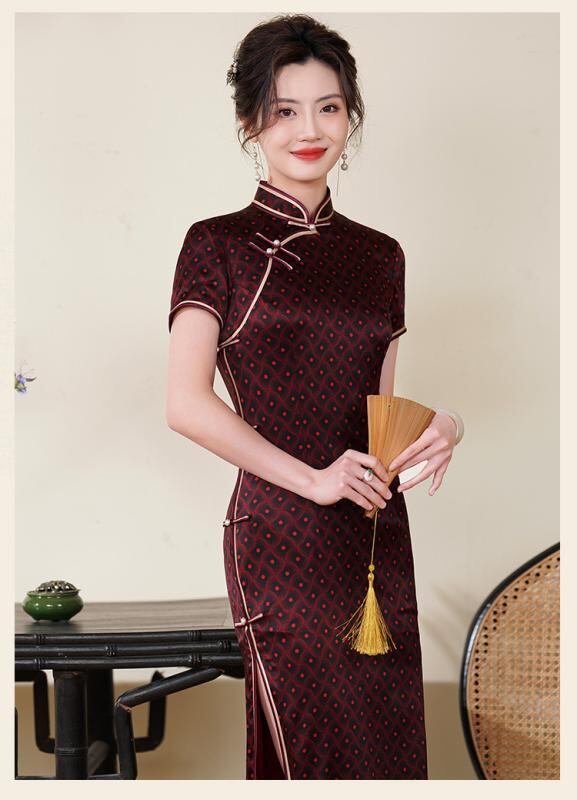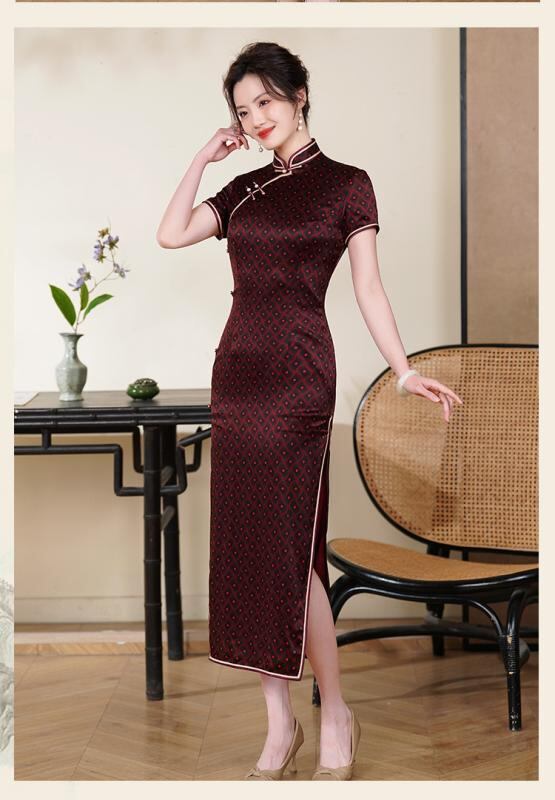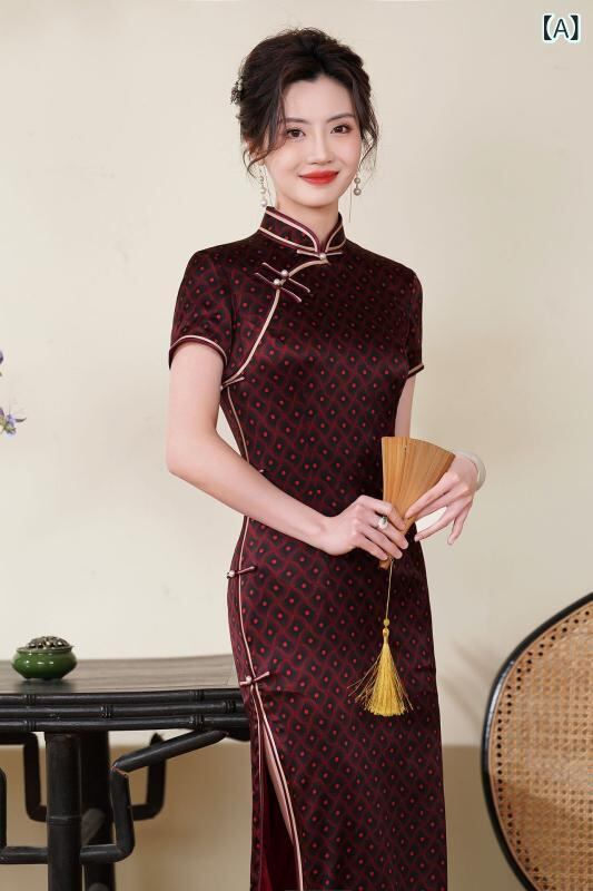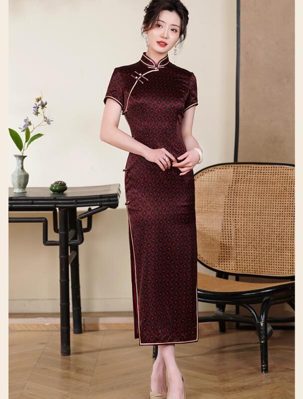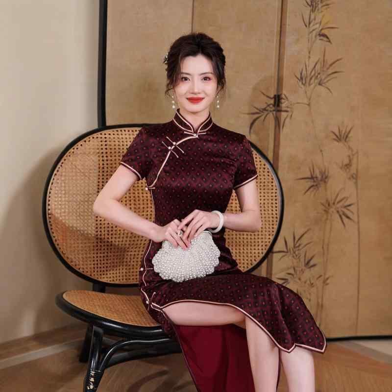 チャイナドレス レディース シルク 桑蚕シルク ロング丈 五分袖 改良型 レトロ おしゃれ スタンドカラー ハイ スリット ストレッチ 高級感 ワンピース 春夏 デジタルプリント