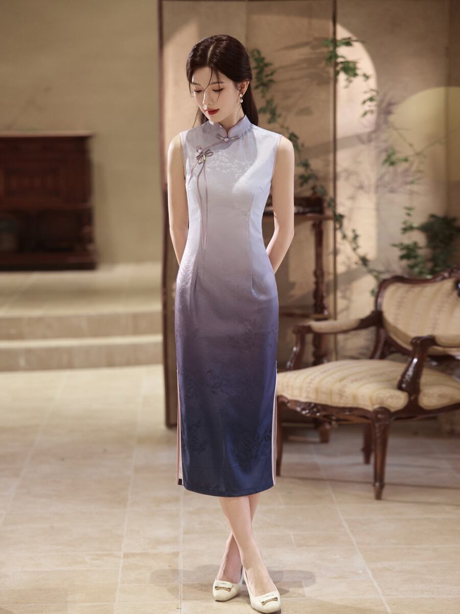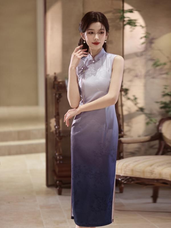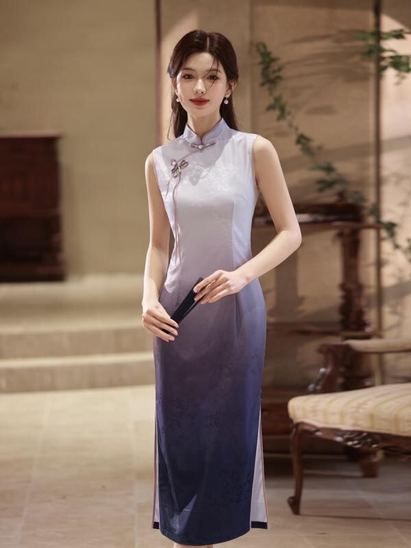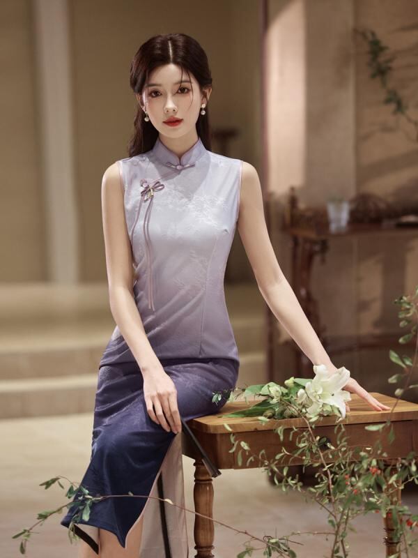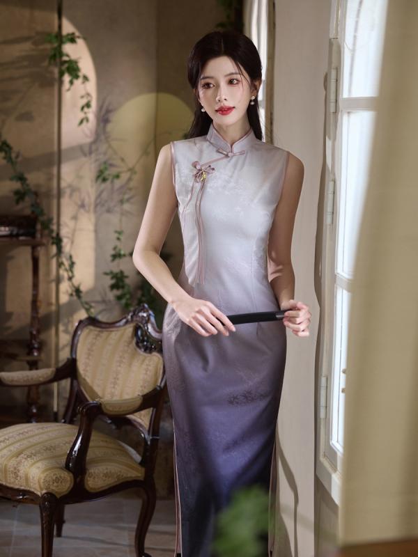 チャイナドレス ノースリーブ スタイリッシュ レディース 紫 チーパオ 夏物 新チャイナ風 向け 上品 エレガント 高級感 ワンピース ドレス