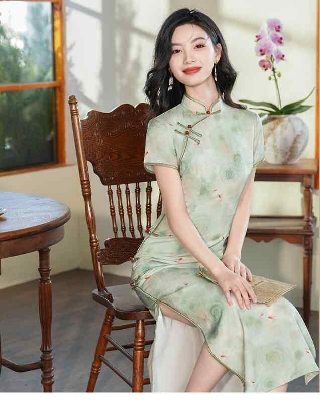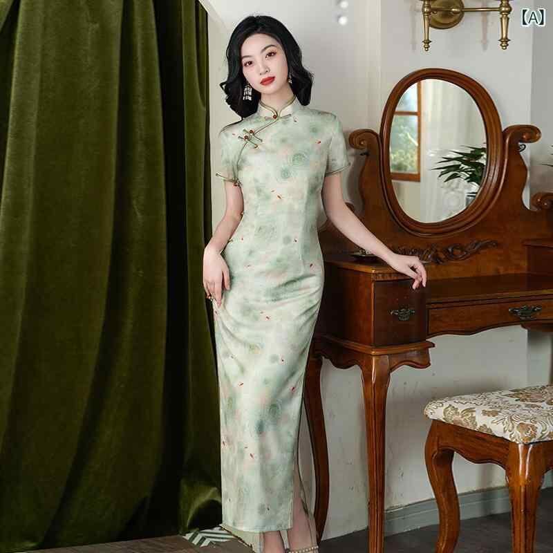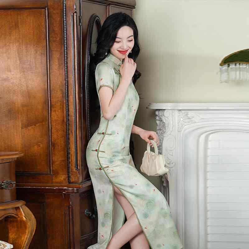 チャイナドレス レディース レトロ 中国風 改良版 半袖 ロング丈 上品 エレガント 日常使い ポリエステル スタンドカラー 斜め襟 きれいめ 春夏 女性用