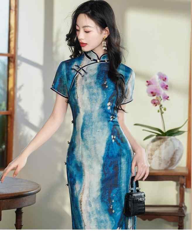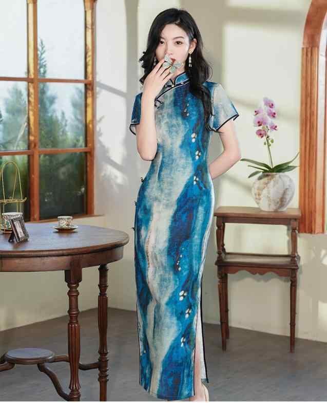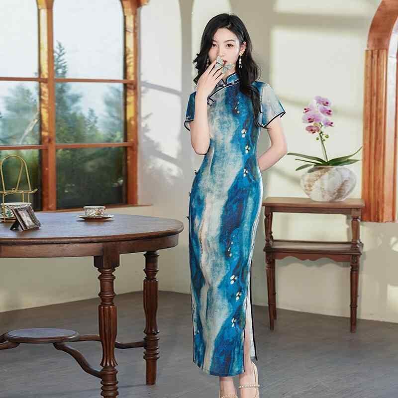 チャイナドレス レディース ロング丈 半袖 改良版 レトロ アジアンテイスト 普段使い スタイルアップ 細見え ポリエステル スタンドカラー 斜め襟 スリット エレガント 通勤 春夏