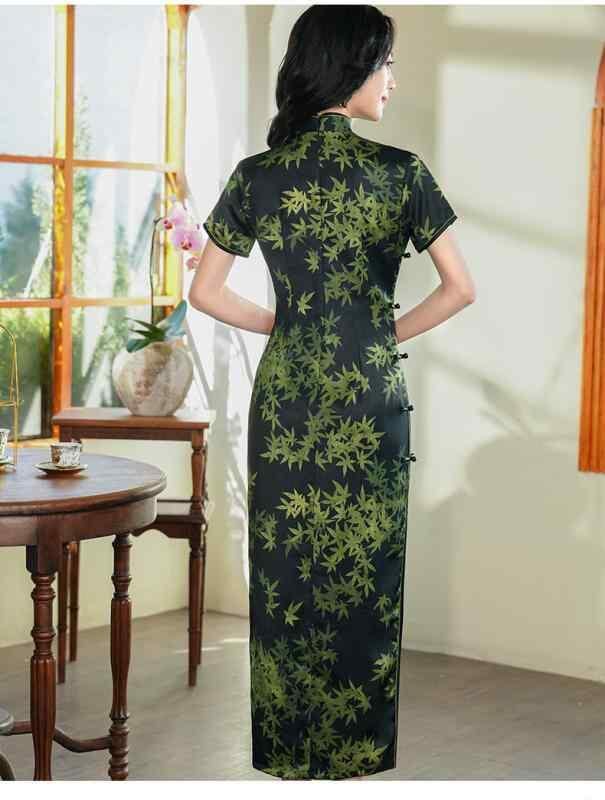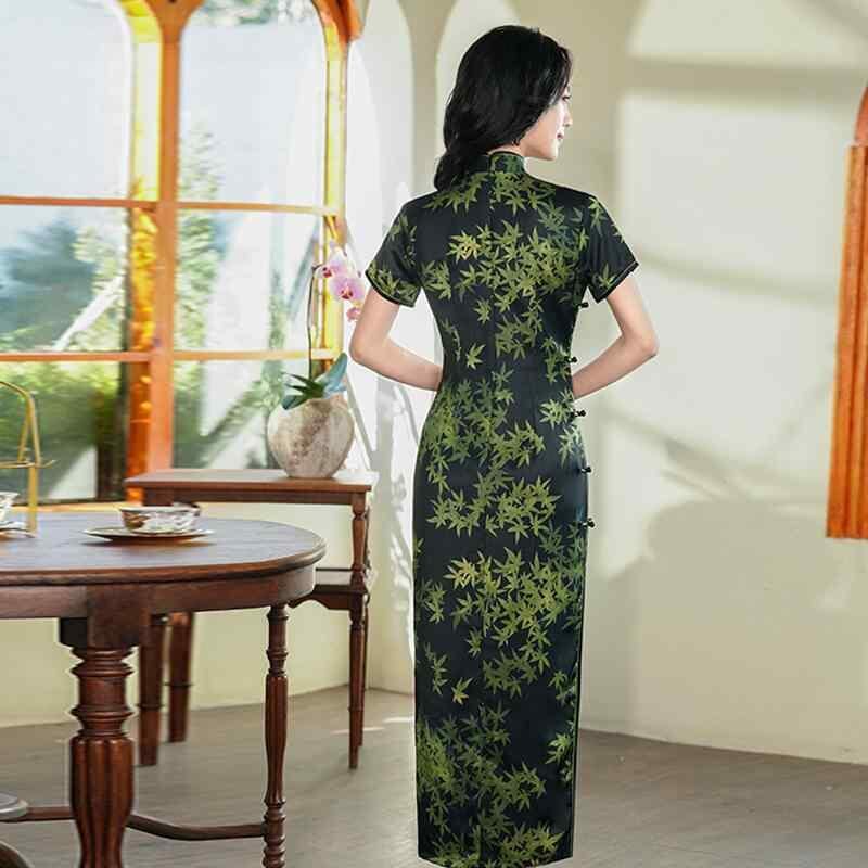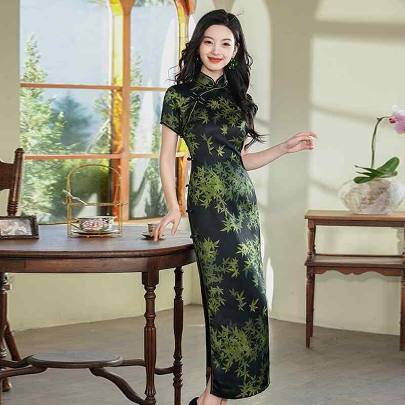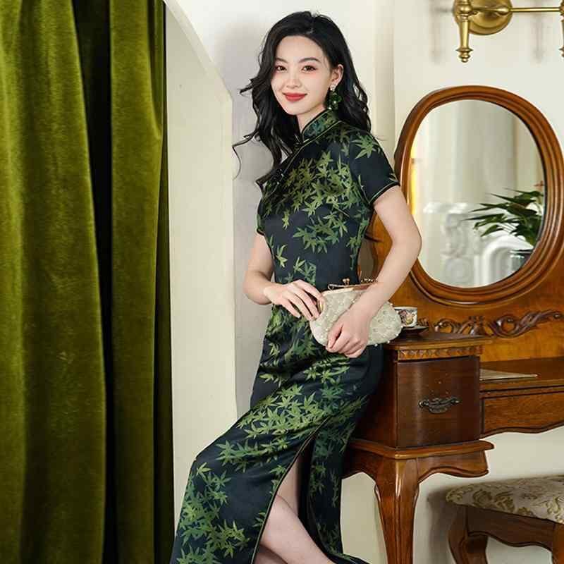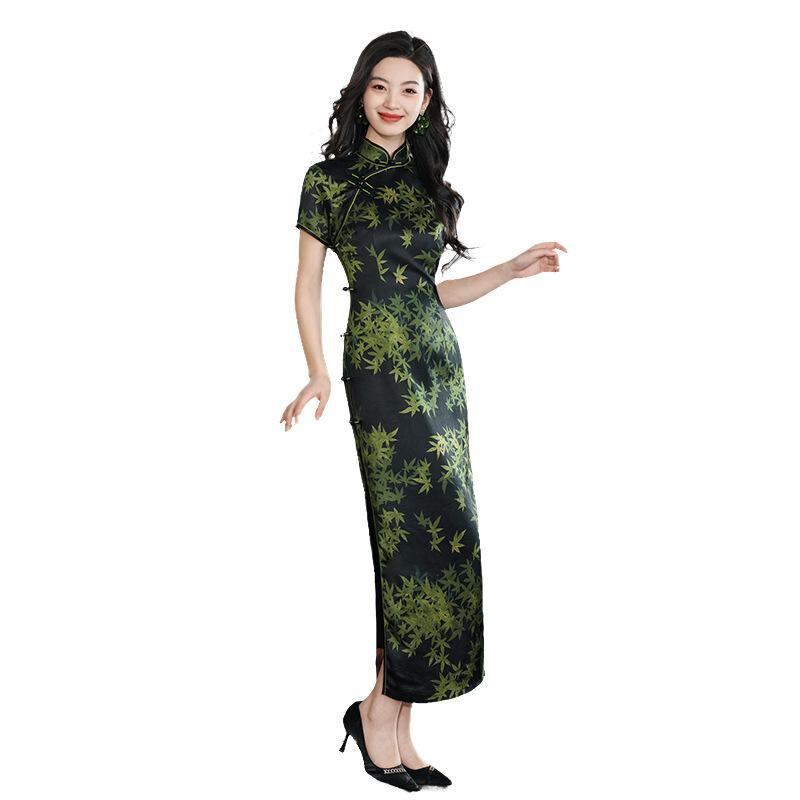 チャイナドレス レディース ロング丈 スタンドカラー スリット 改良 新中華風 レトロ エレガント 春夏 パーティー お呼ばれ フォーマル ダークグリーン ポリエステル素材