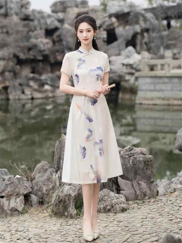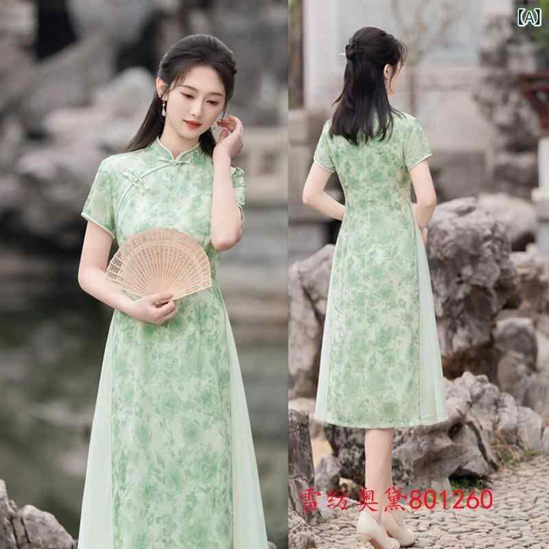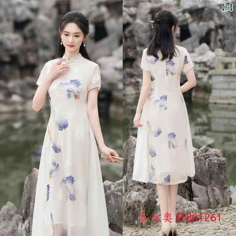 チャイナドレス レディース アオザイ風 中国風 レトロ モダン ロング丈 半袖 シフォン ポリエステル エレガント 薄手 ストレッチ 普段使い デイリーユース お出かけ 春夏