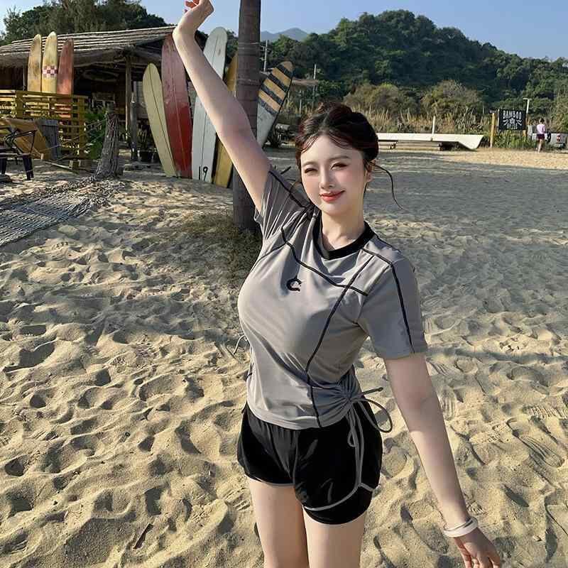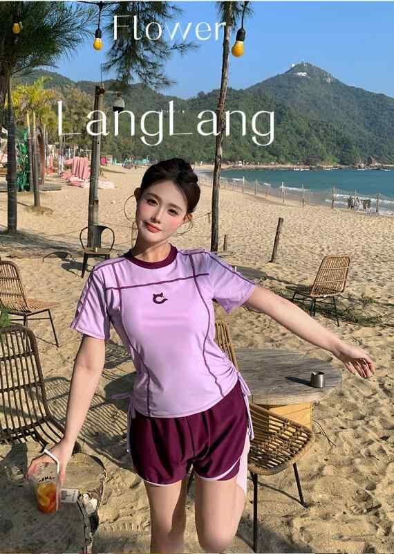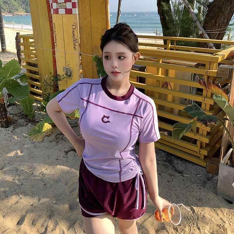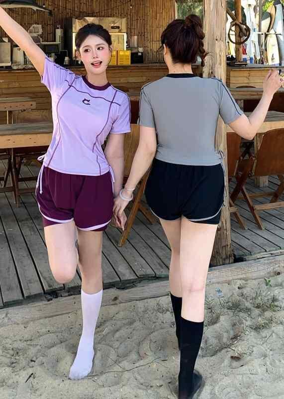 水着 レディース スイムウェア 大人用 セパレート 半袖 ショートパンツ 体型カバー UVカット 日焼け防止 露出控えめ 温泉 プール 海水浴 スイミング ジム フィットネス ブラック系 パープル系 ナイロン ポリエステル素材