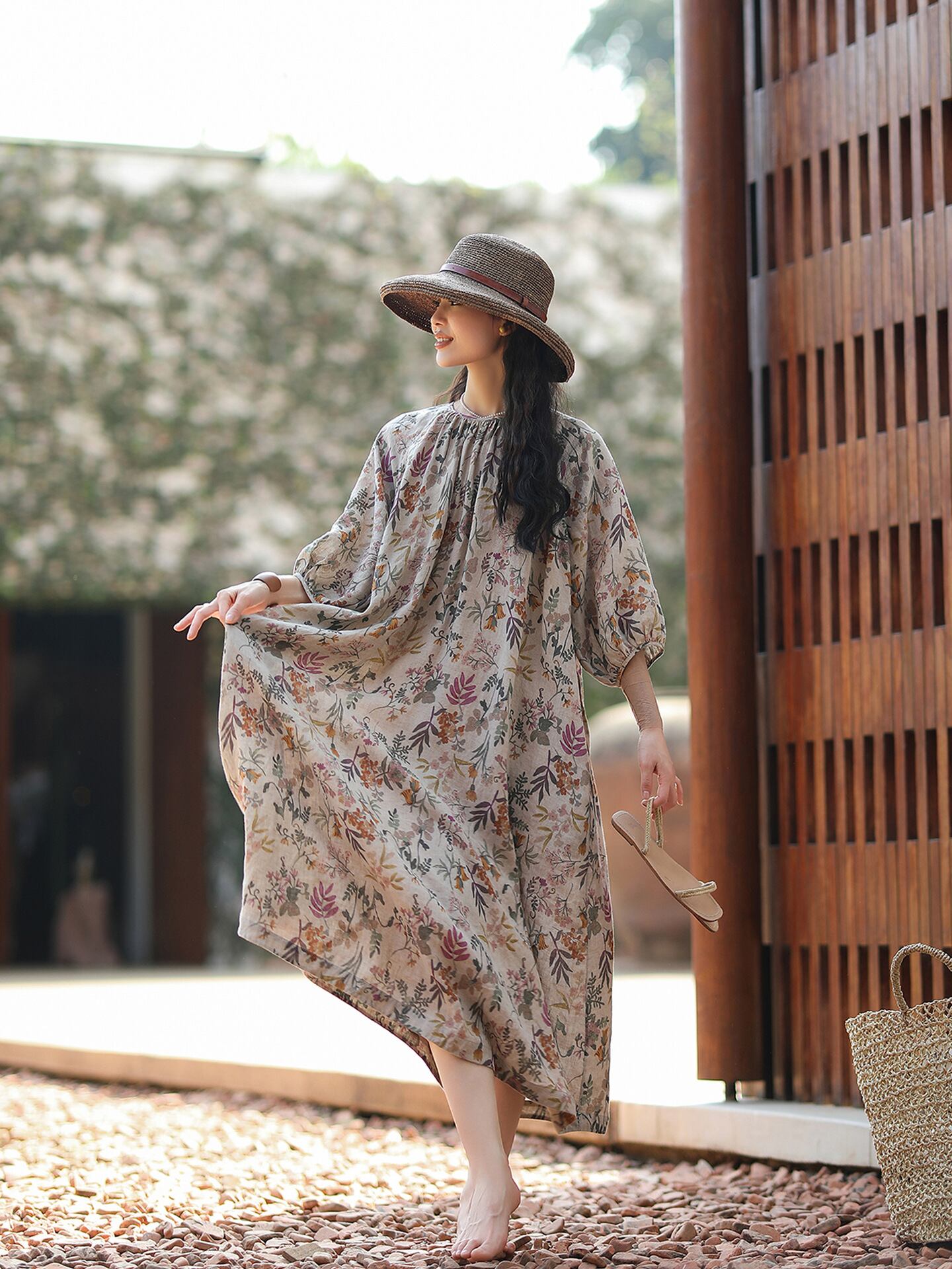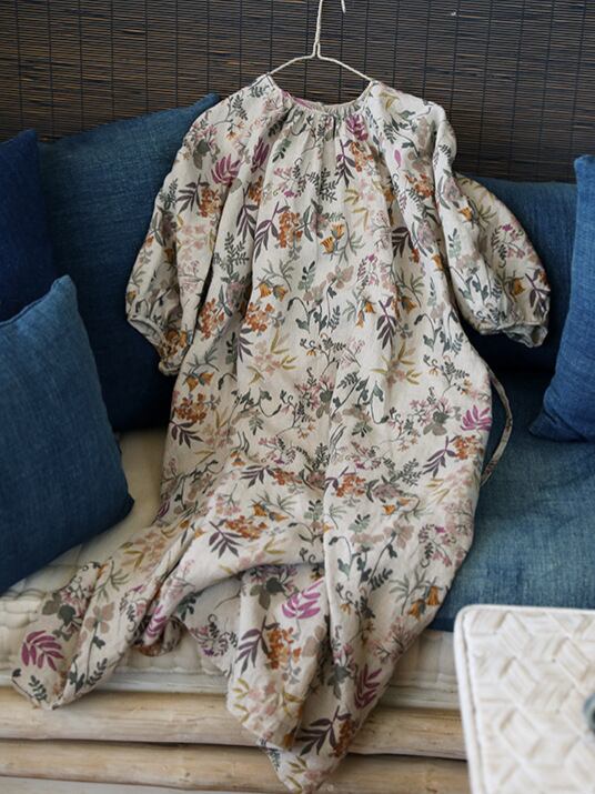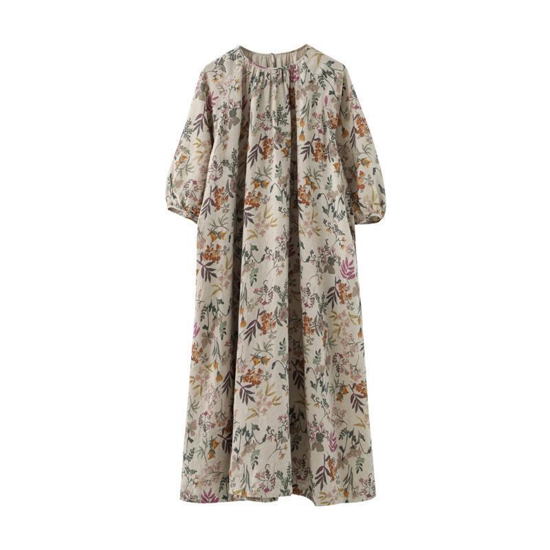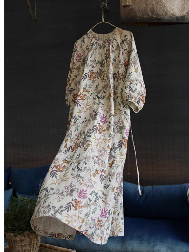 ワンピース リネン 麻 ナチュラルカラー 花柄プリント ラグランスリーブ レトロ ヴィンテージ カジュアル ゆったり ルーズ Aライン 体型カバー 細見え ロング丈 七分袖 春夏