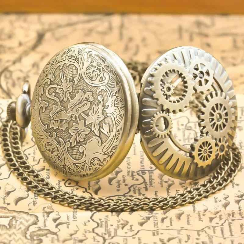 懐中時計 ユニセックス レトロ アンティーク スチームパンク ブロンズ 合金製 透かし彫り 歯車 クオーツ 丸型 ネックレス ペンダント プレゼント