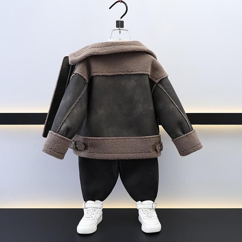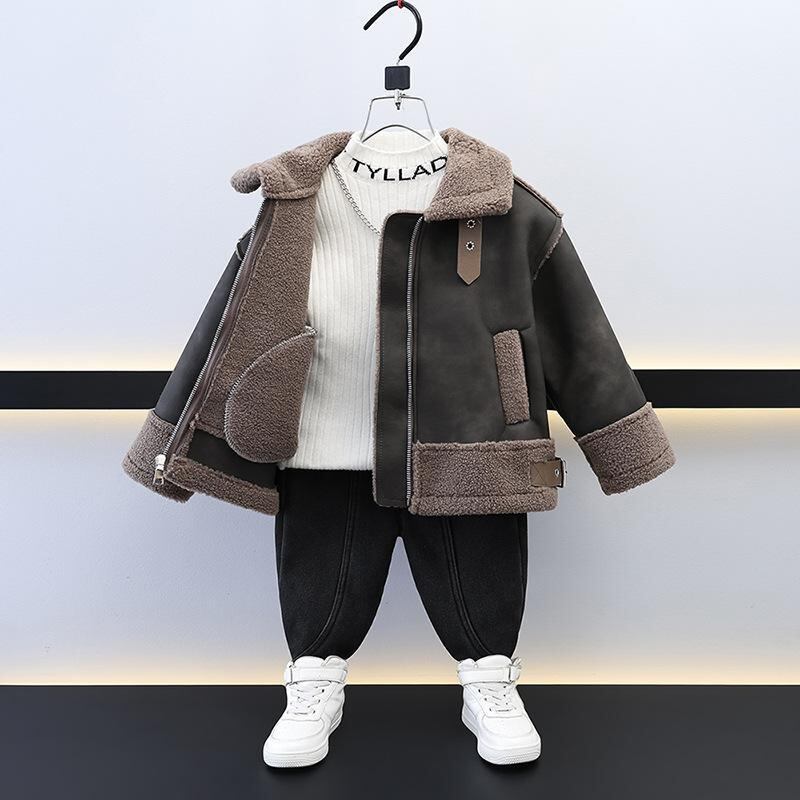 ジャケット 男の子 キッズ 子供服 スエード フェイクムートン ボア 裏起毛 あたたかい 保温 防寒 ショート丈 カジュアル 秋冬 襟付き 長袖 ジップアップ 無地 韓国風 通園 通学 普段使い グレーグリーン