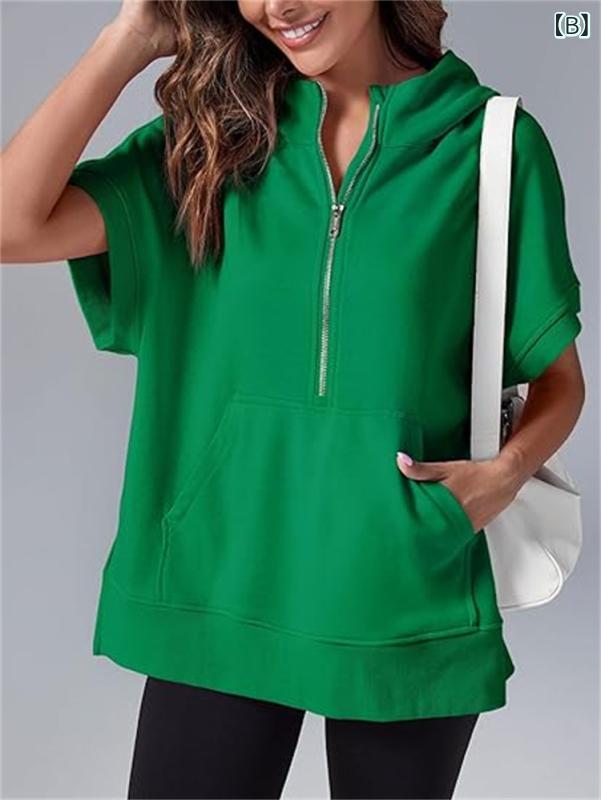 パーカー レディース 女性用 半袖 ハーフジップ プルオーバー スウェット トレーナー フーディ オーバーサイズ ビッグシルエット ゆったり ポケット付き カジュアル リラックス ストリート スポーツ 春夏 ポリエステル ミドル丈