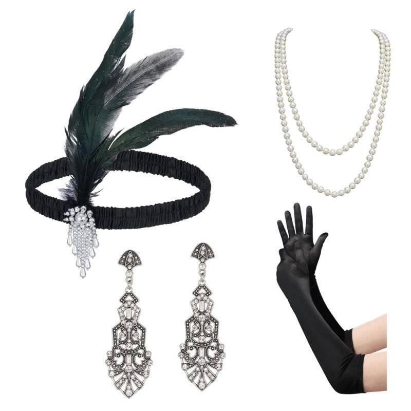 アクセサリー セット レディース フェザーヘッドバンド パール ネックレス ピアス ブレスレット 4点セット ヴィンテージ マスカレード バチェロレッテパーティー 仮装 ドレスアップ