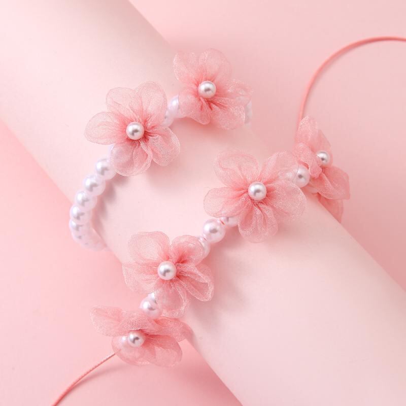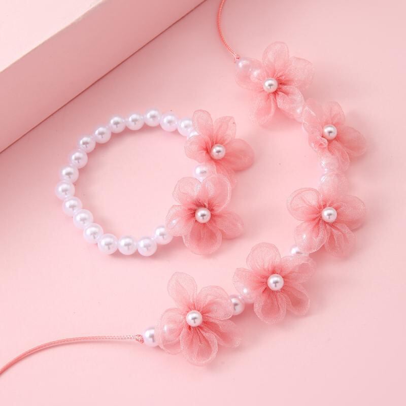 アクセサリー キッズ 女の子 手作り ハンドメイド ビーズ パール フラワーモチーフ 紗素材 ブレスレット ネックレス セット かわいい 普段使い お出かけ プレゼント ギフト