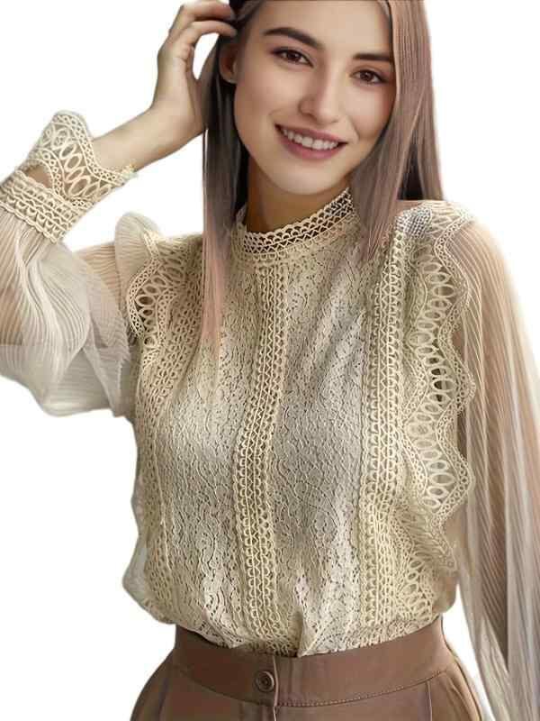 ブラウス レディース エレガント 上品 シアー レース 無地 長袖 パフスリーブ ラウンドネック プルオーバー 切り替え ポリエステル ポリウレタン 通勤用 白 ピンク ベージュ 黒