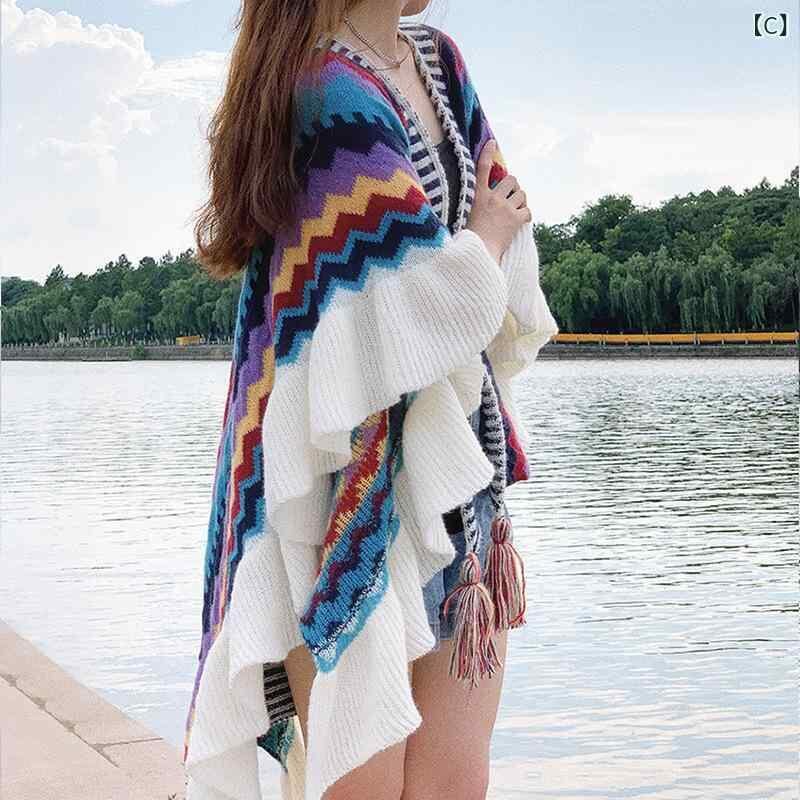 ショール レディース ニット ポンチョ 羽織り 民族風 ボヘミアン エスニック柄 旅行 リゾート フェイクカシミヤ 大判 体型カバー 日よけ 冷房対策 春夏秋
