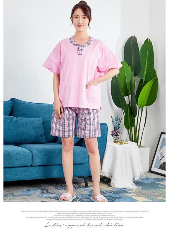 ルームウェア 男女兼用 カップル 綿混 薄手 パジャマ 部屋着 バスローブ サウナスーツ マッサージ エステ 湯上がり ショートパンツ チェック柄 上下セット 春夏