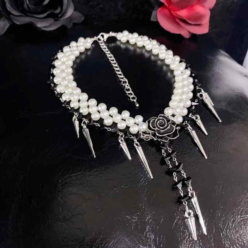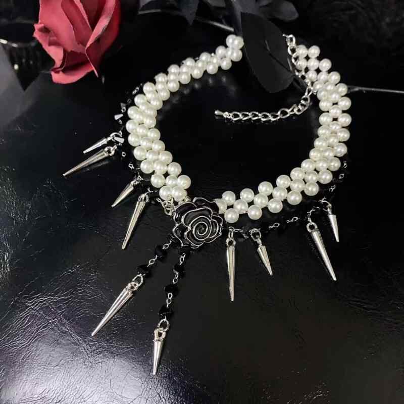 ネックレス レディース カメリア フェイクパール スイートクール ゴシック パンク ダーク フラワーモチーフ チョーカー ショートネックレス ハンドメイド 重ね付け 個性派アクセサリー ファッション小物 オフホワイト アイボリー 普段使い カジュアル