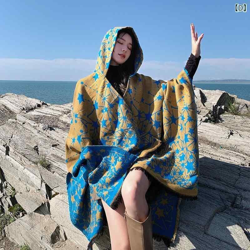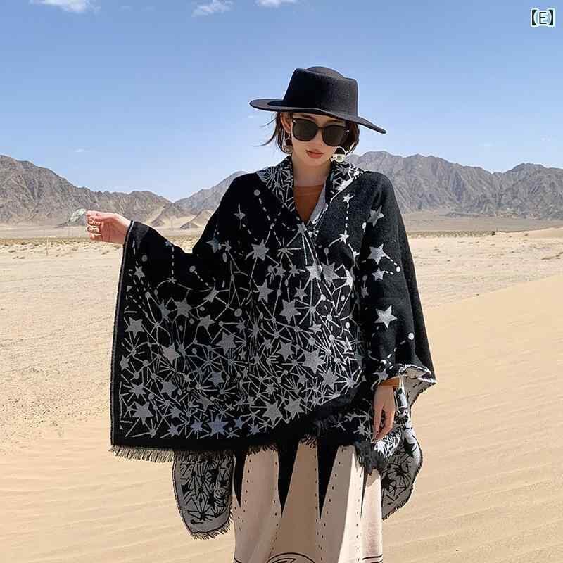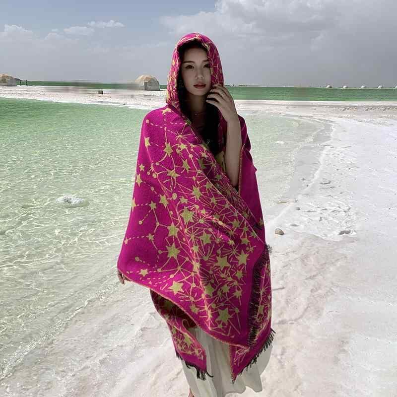 ポンチョ レディース フード付き 星柄 スター柄 ケープ ショール ストール 保温 あったか 旅行 トラベル リゾート 普段使い オールシーズン ボヘミアン エスニック レトロ 羽織り