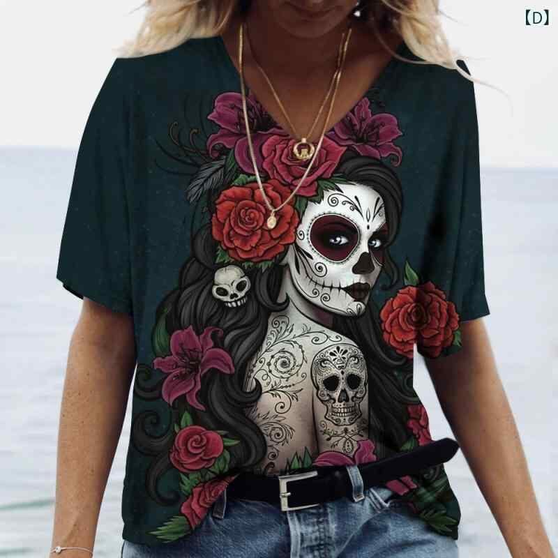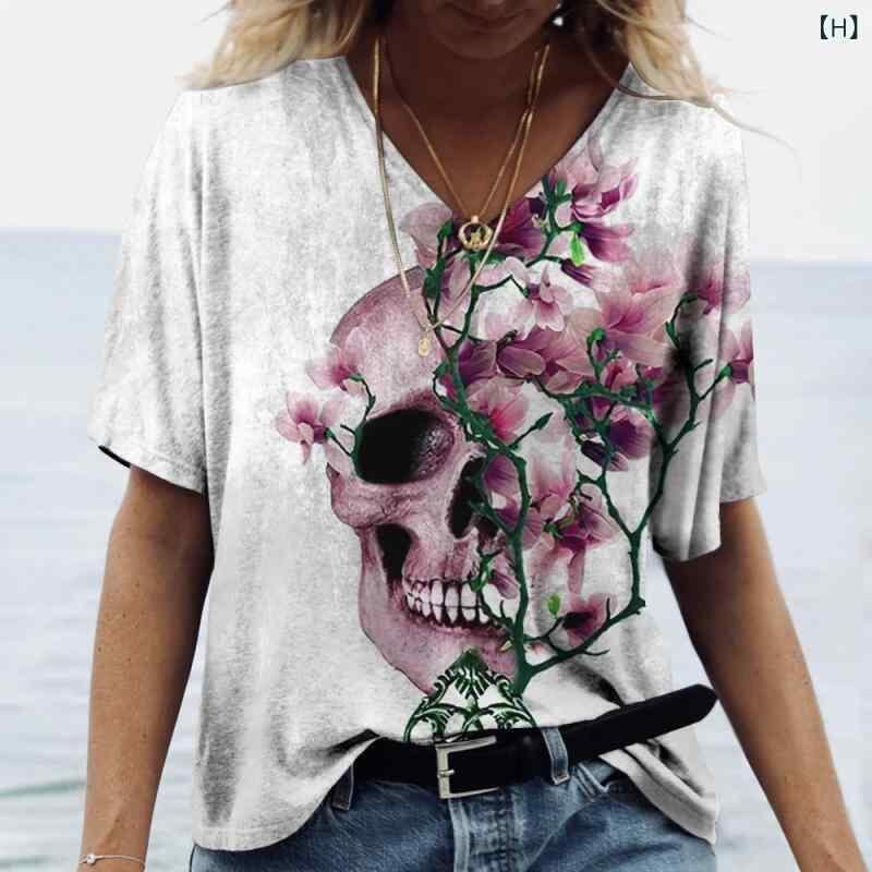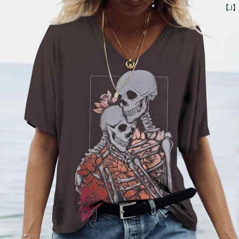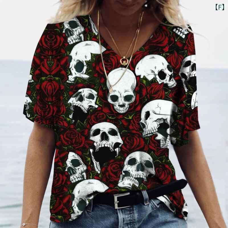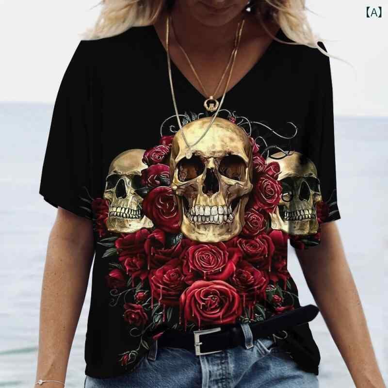Tシャツ レディース 女性用 スカル柄 3D 立体 プリント 半袖 Vネック ゆったり ルーズフィット 再生繊維 ポリエステル ミドル丈 チュニック丈 春夏 カジュアル 普段使い