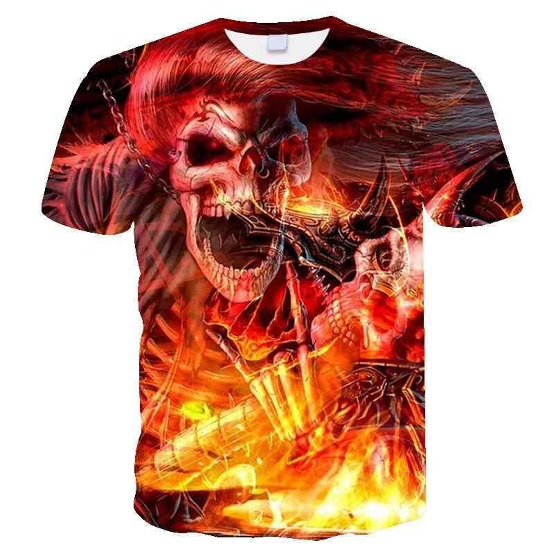 Tシャツ 男女兼用 ユニセックス 炎 スカル ドクロ 3Dデジタルプリント グラフィックプリント 半袖 ラウンドネック 丸首 ルーズフィット ゆったり ビッグシルエット ポリエステル 欧米スタイル ストリート系 カジュアル 普段着 部屋着 春夏