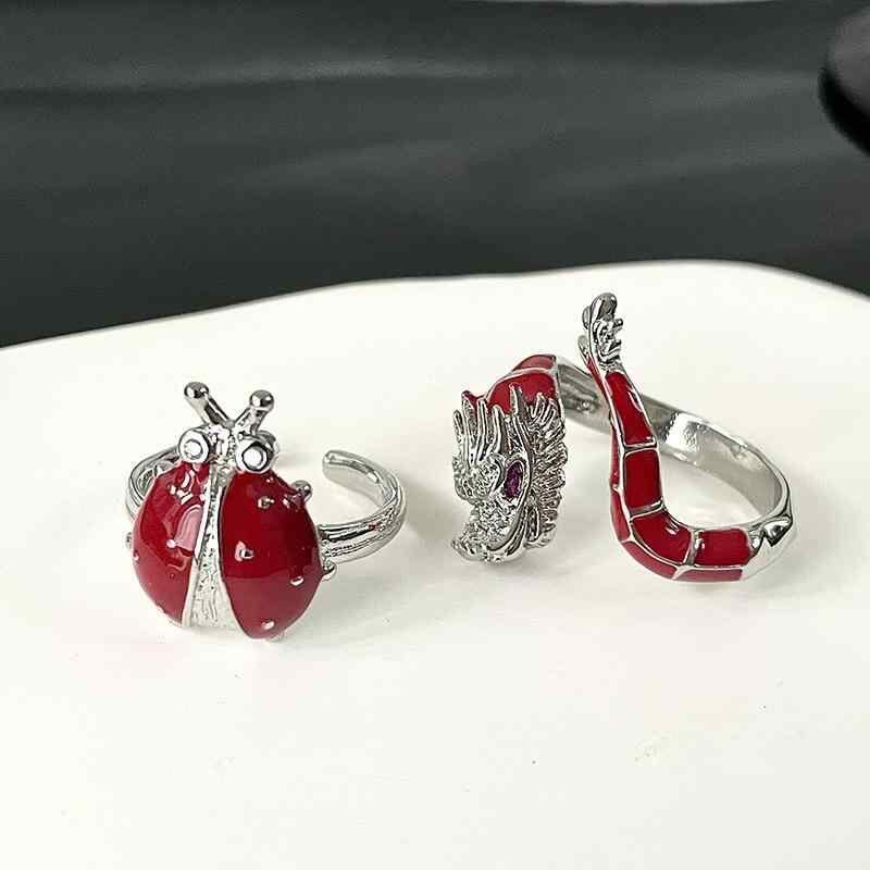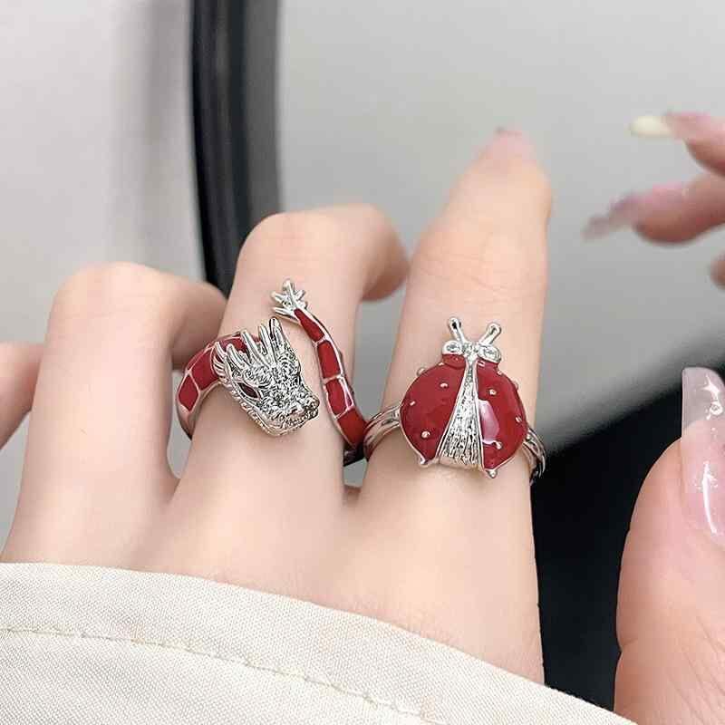 リング レディース 動物モチーフ テントウムシ ドラゴン 赤 レッド 銅製 エナメルドリップ加工 オープンリング 指輪セット 個性的デザイン フリーサイズ サイズ調整可能 普段使い カジュアル