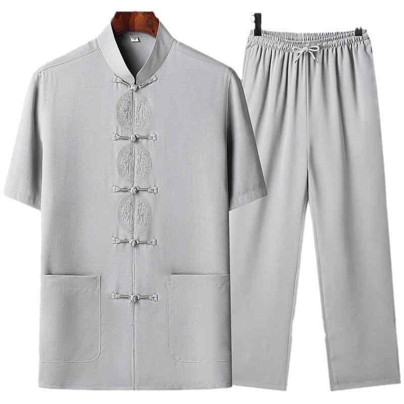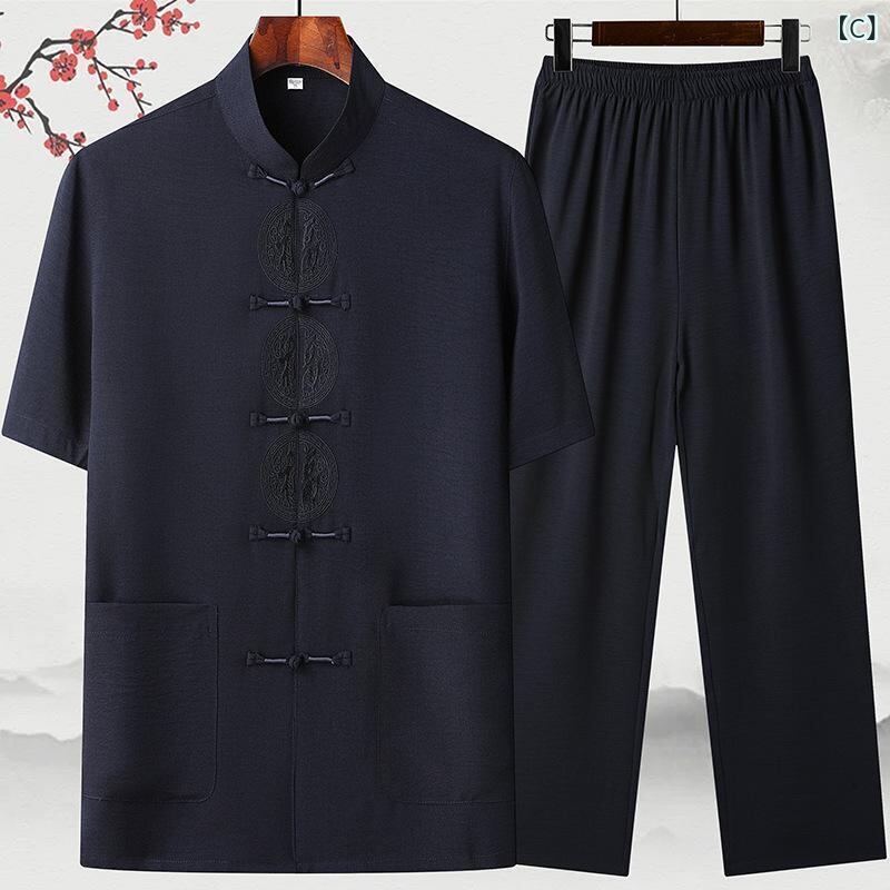 セットアップ メンズ 男性用 中国風 唐装 太極拳ウェア 半袖 無地 綿麻素材 高級感 中高年向け カジュアルスタイル 春夏