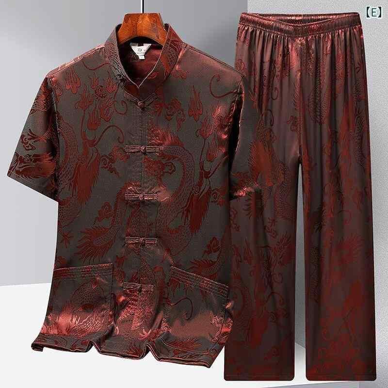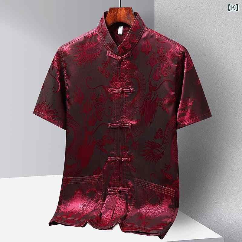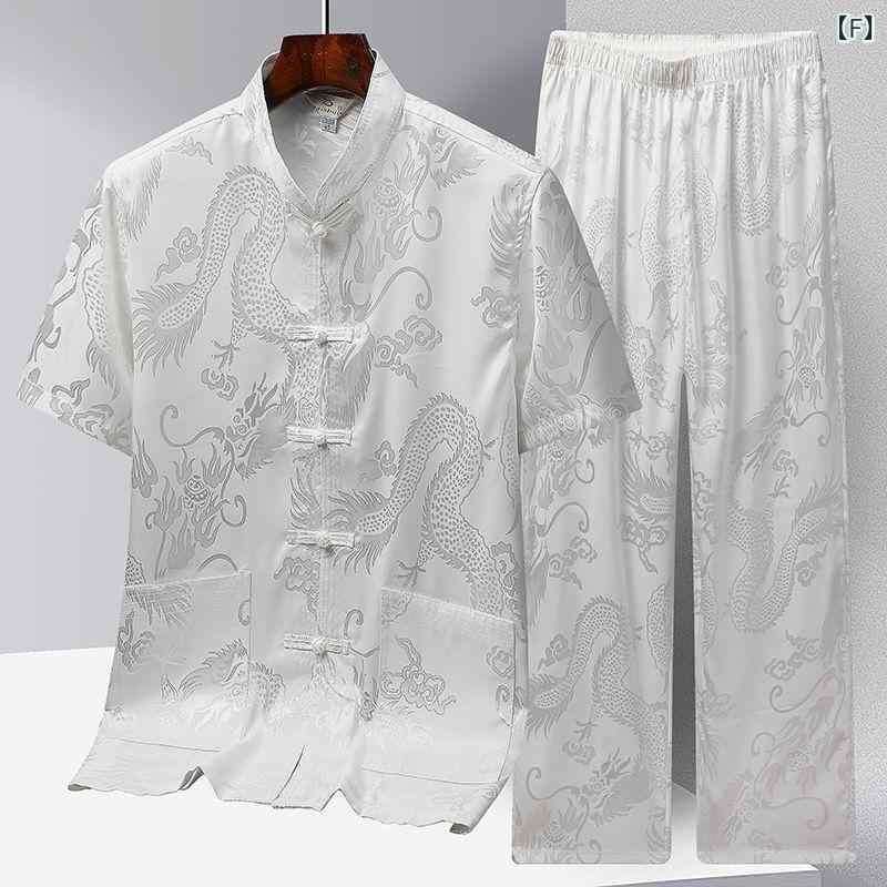 セットアップ メンズ 中高年 男性用 新中国風 半袖 シャツ 接触冷感 ポリエステル 混紡 太極拳ウェア 朝の運動 イージーケア 春夏