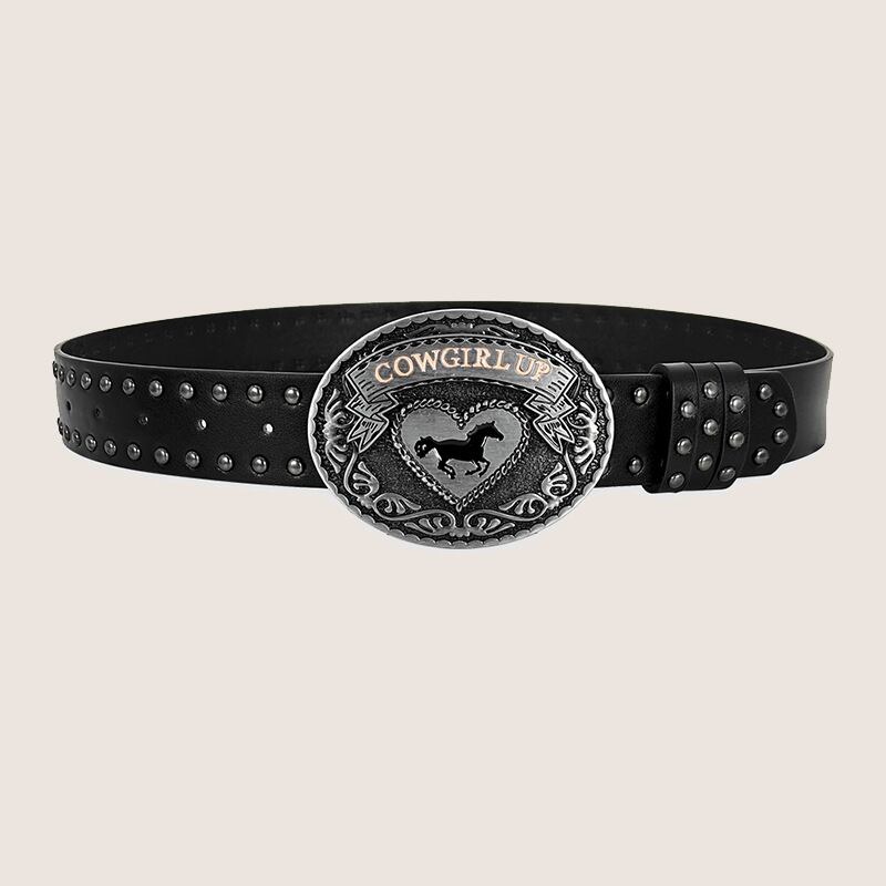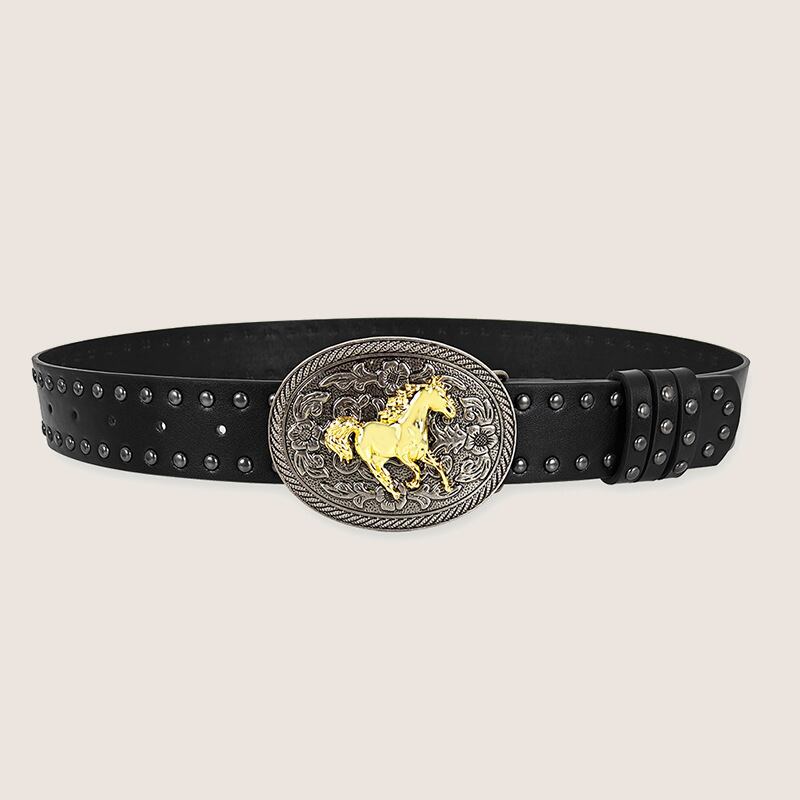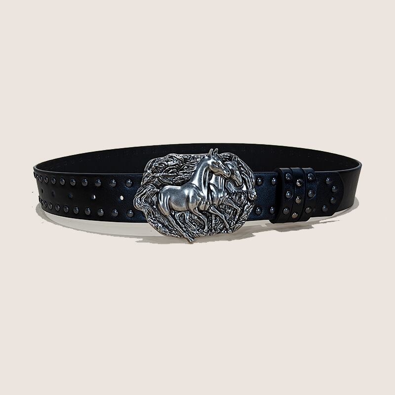 ベルト ジェンダーレス ウエストベルト ウエスタン風 アメリカンレトロ サブカルチャー ビッグバックル 馬頭モチーフ スタッズ装飾 個性的 ヒップホップ パンク ファッション小物 PUレザー 合金 ストリート系 カジュアル アメカジ