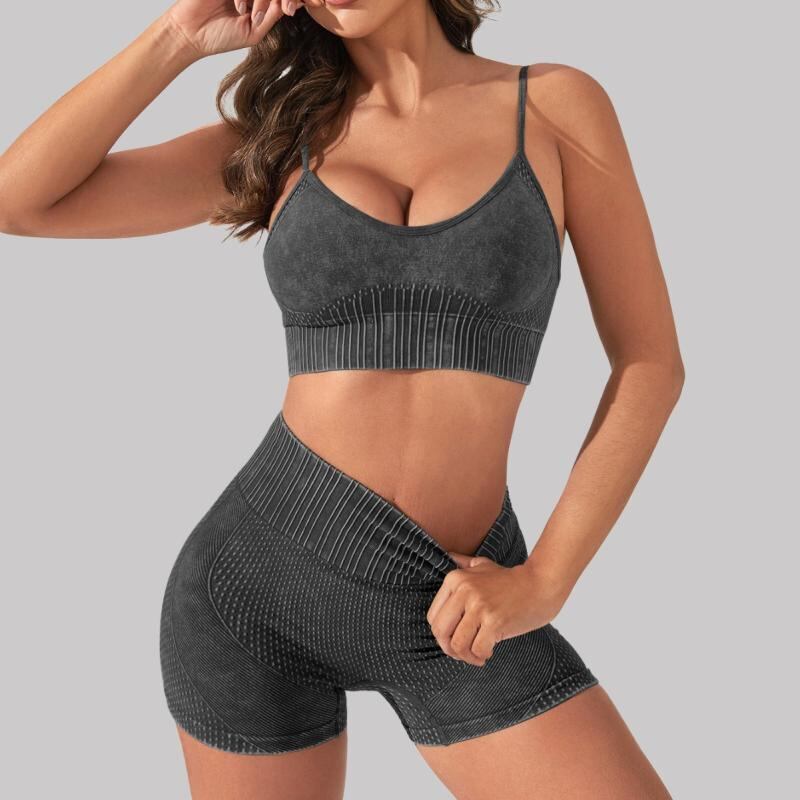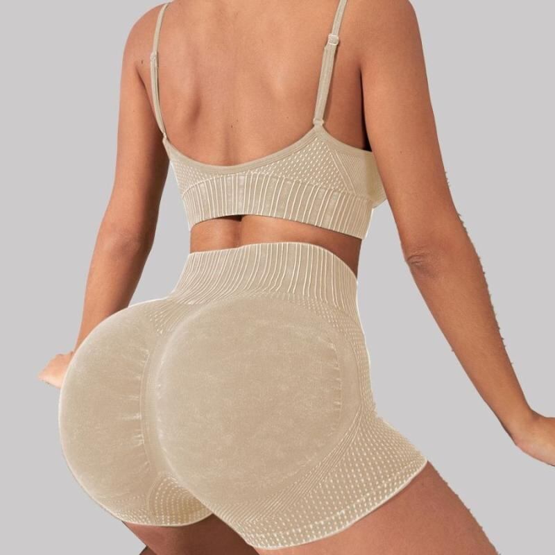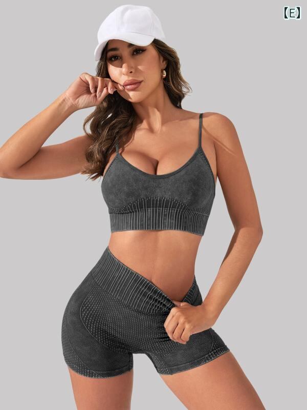 セットアップ レディース ヨガ フィットネス スポーツ シームレス ブラトップ 桃尻 ショートパンツ ナイロン スパンデックス ウォッシュ加工 通気性 伸縮性 ジム トレーニング ランニング 2点セット オールシーズン