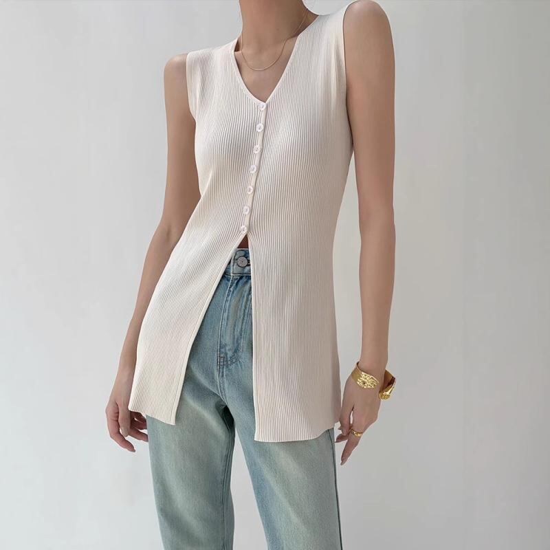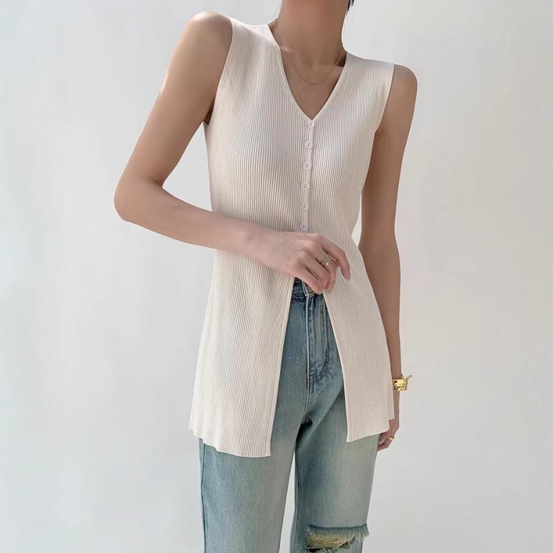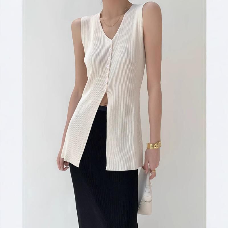 ニットベスト レディース ノースリーブ フレンチネック 接触冷感 薄手 軽量 ポリエステル素材 ミドル丈 ゆったり ルーズシルエット カジュアル 普段使い オフィス レイヤード 重ね着 ジレ ニットトップス
