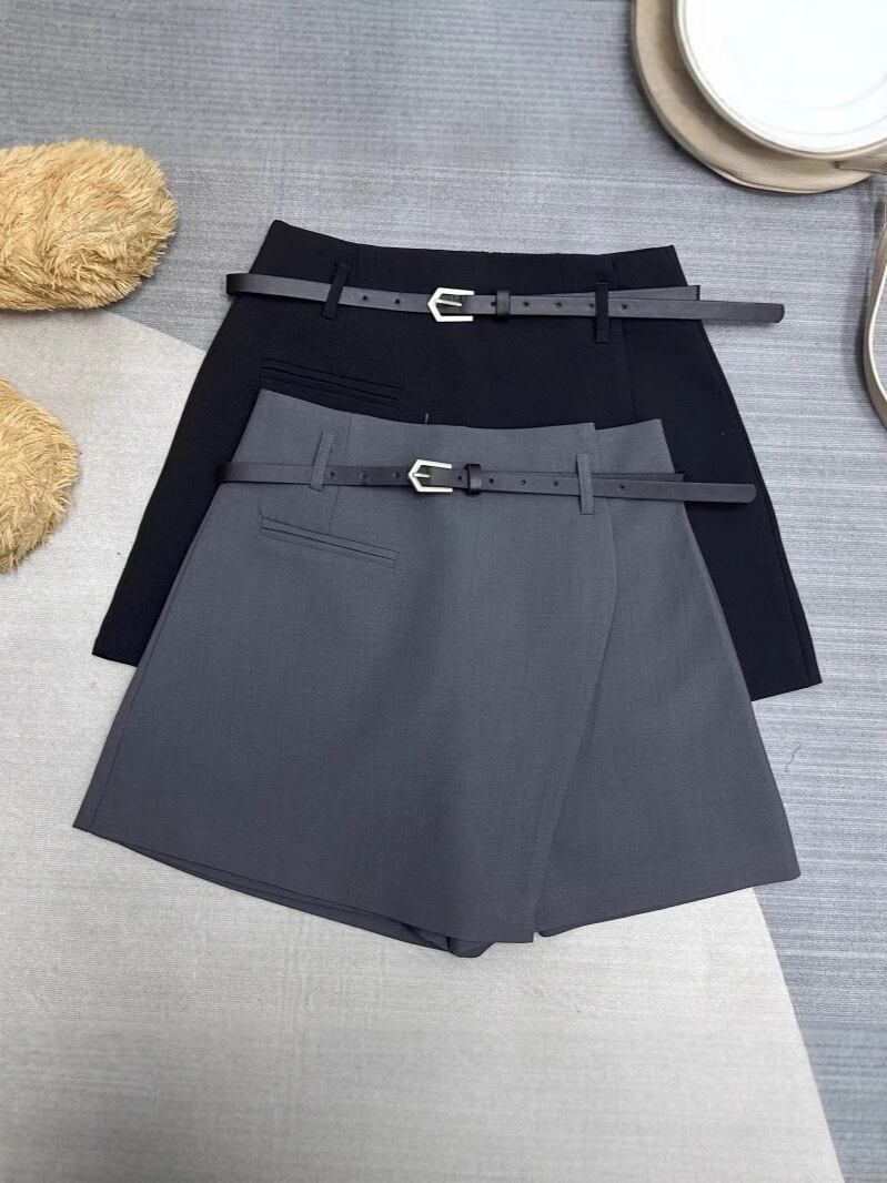 スカパン レディース アシンメトリー ハイウエスト ショート丈 Aライン インナーパンツ付き スーツ生地 再生繊維 きれいめ 通勤 オフィス エレガント 着痩せ効果 春夏 微ストレッチ グレー ブラック