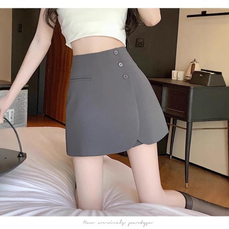 スカパン レディース 大きいサイズ 体型カバー Aライン アシンメトリー ハイウエスト 細見え ミニ丈 春夏 スーツ地 ポリエステル 無地 シワになりにくい 微ストレッチ ブラック グレー フェミニン カジュアル