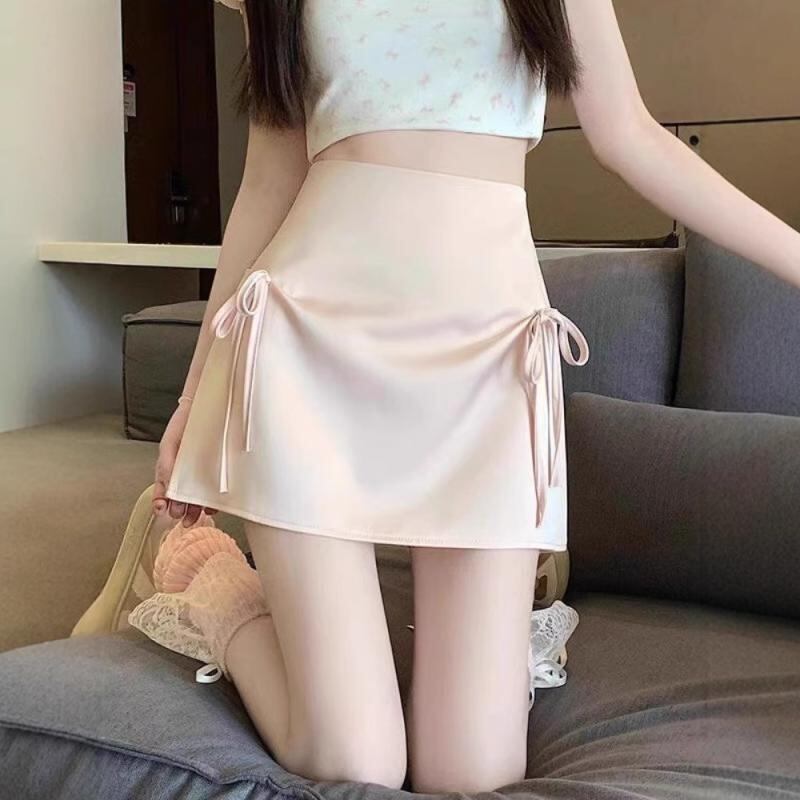 スカート レディース フェミニン リボンタイ 黒 ハイウエスト Aライン ミニ丈 ポリエステル素材 透け防止 無地 ストレッチ 秋冬 シャンパンカラー