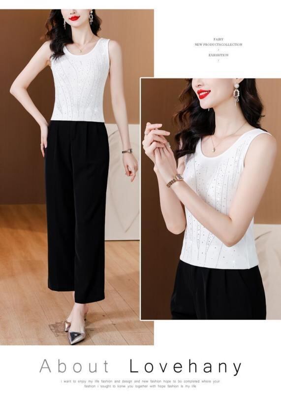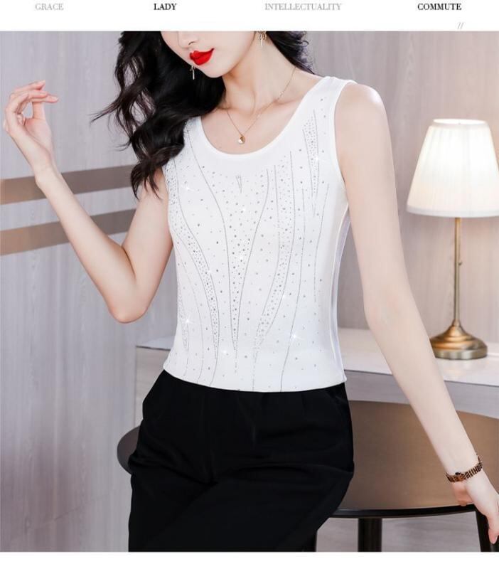 タンクトップ レディース ノースリーブ スリムフィット ラインストーン トップス シェニール 接触冷感 吸湿速乾 エレガント 上品 ファッション キャミソール 丸首 細身 ストレートシルエット
