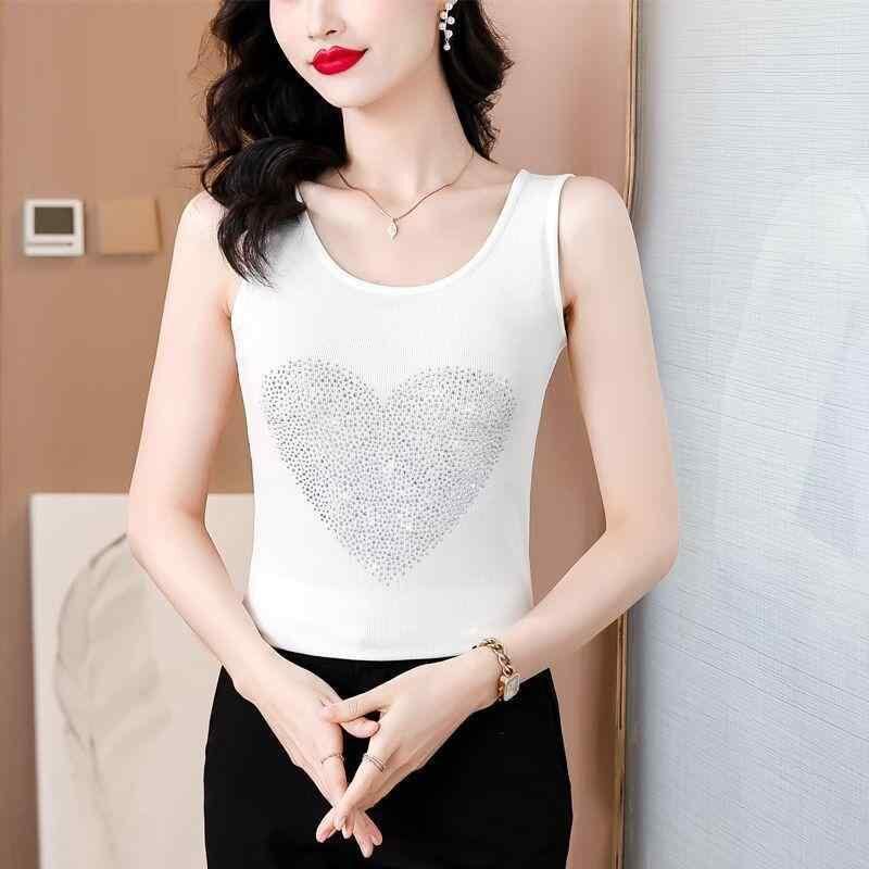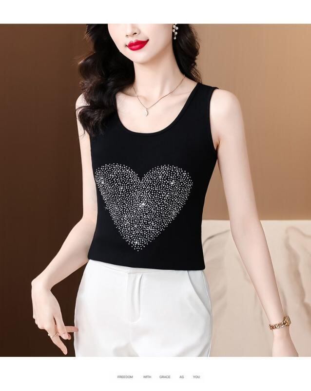 ノースリーブ レディース ミセス プラスサイズ ラインストーン キラキラ ゆったり リラックスフィット 接触冷感 リブ シェニール スパンデックス インナー アウター 重ね着 春夏 ホワイト ブラック ハート柄