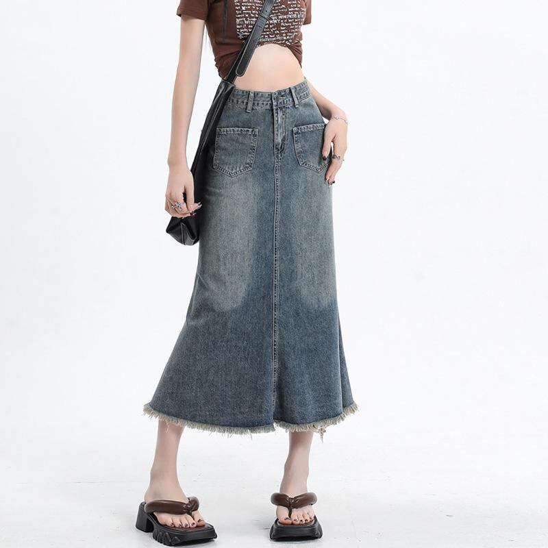 スカート レディース デニム マーメイド Aライン ハイウエスト フリンジ 体型カバー レトロブルー ウォッシュ加工 綿 コットン 夏 きれいめ 普段使い