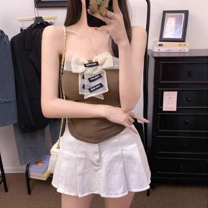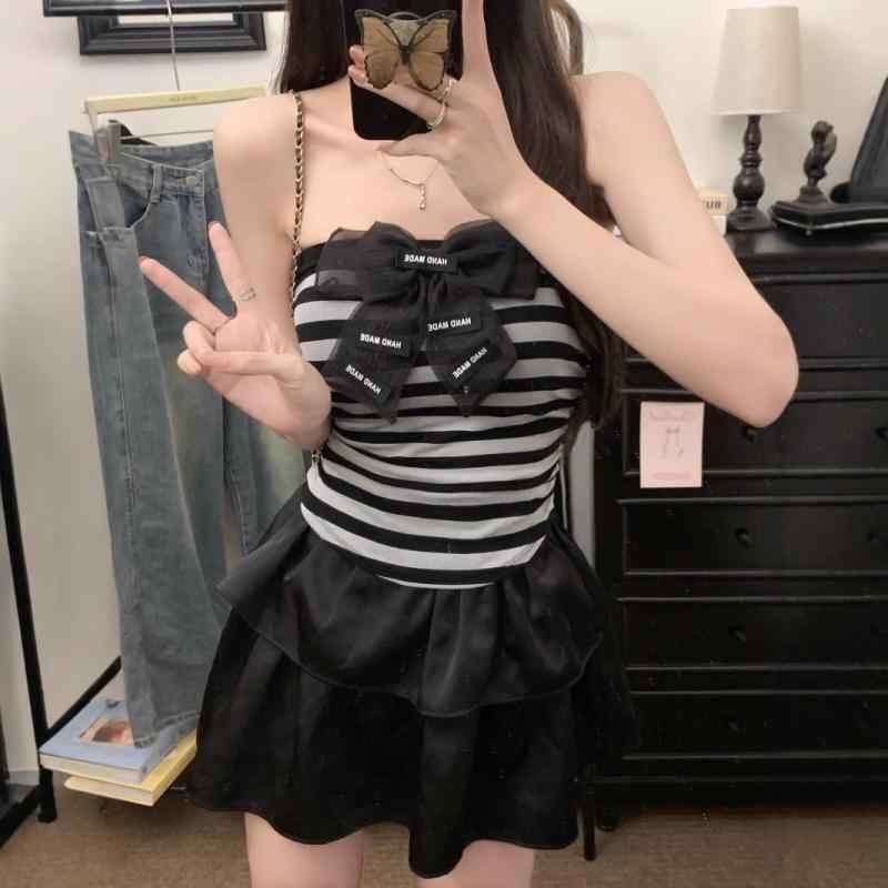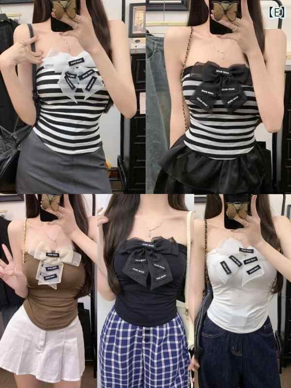 チューブトップ ノースリーブ レディース ホルターネック バックオープン ショート丈 カップ付き オーガンジー リボン フレンチデザイン スリムフィット ストライプ柄