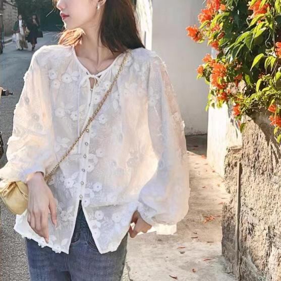シャツ レディース 韓国風 かわいい おしゃれ 早春 トップス 刺繡 レース コットン ポリエステル 泡袖 長袖 ゆったり ラウンドネック カーディガン ブラウス 白